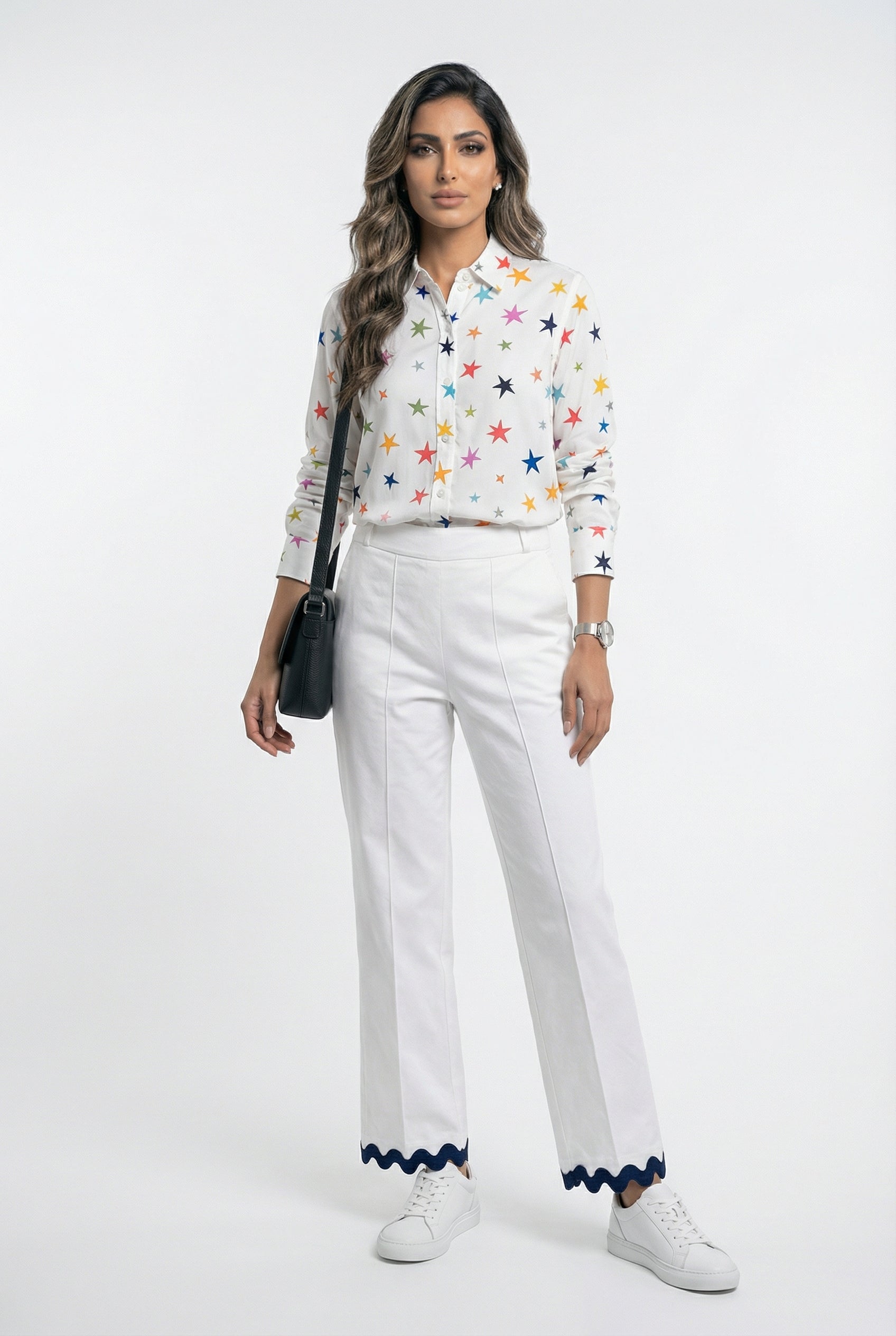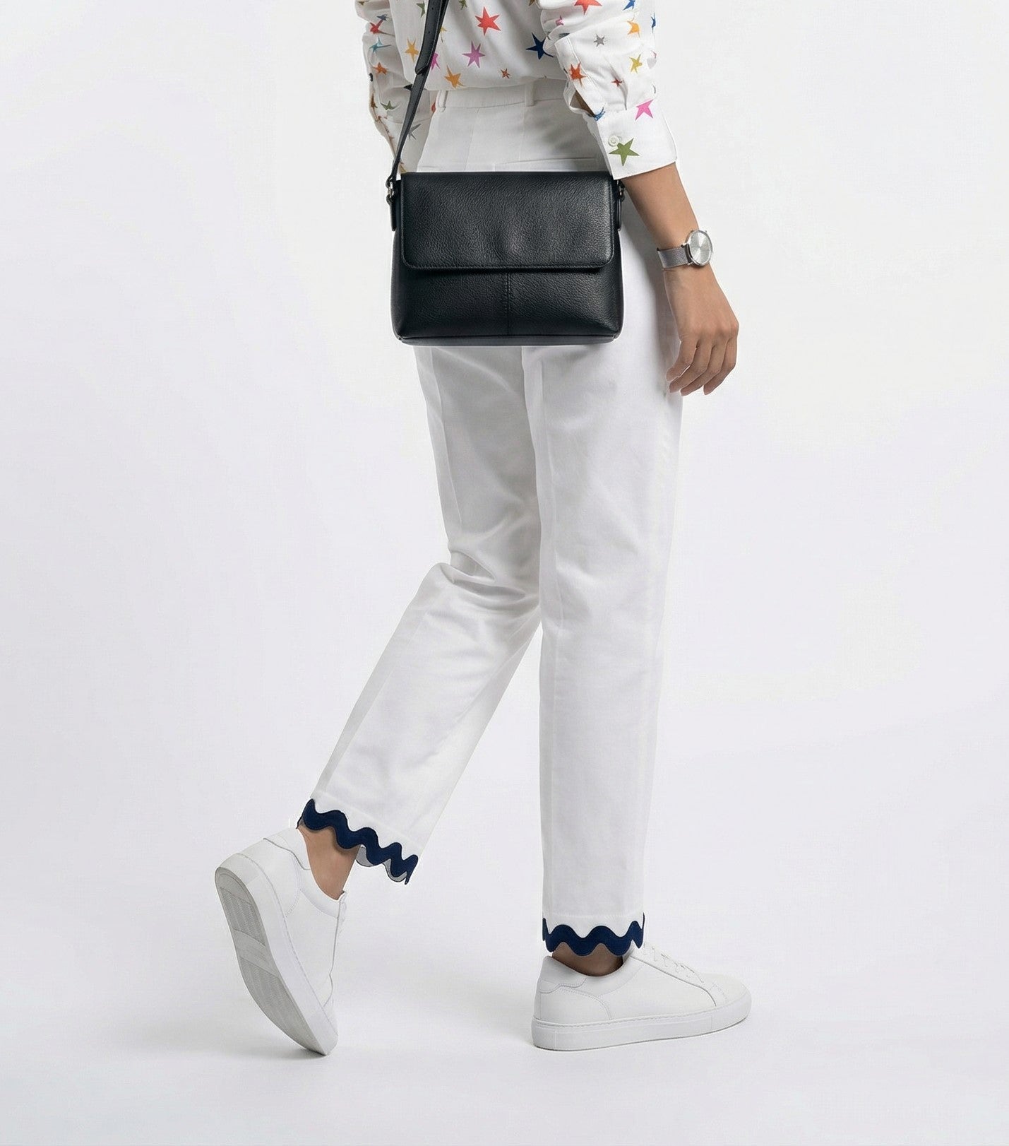 Stretchable Waistband Straight Cut Mid Rise Pants with navy blue ruffle trim, side pockets, front seam and back welt details