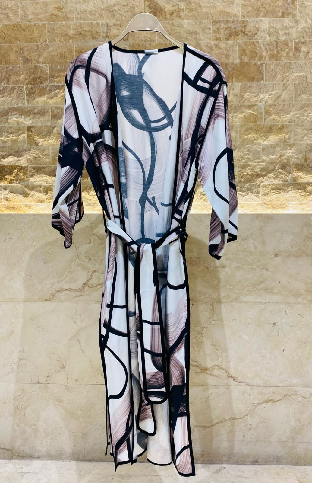 Patterned Linen Long Kimono with black hem details, removable belt , side long slit and wide long sleeve