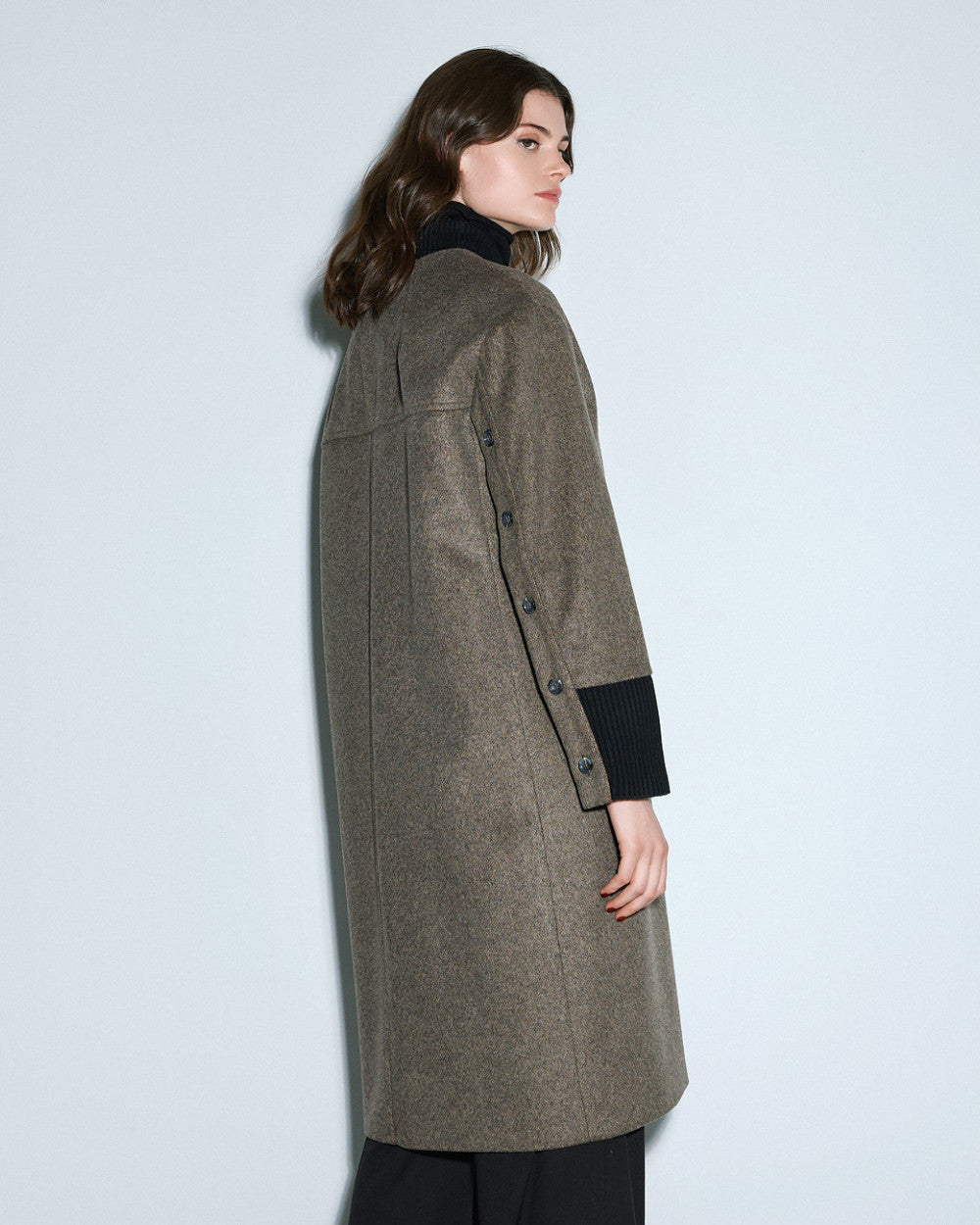 Ribbed Neckline Buttoned Long Coat with side pockets and long sleeve with slit and buttons details with ribbed cuff