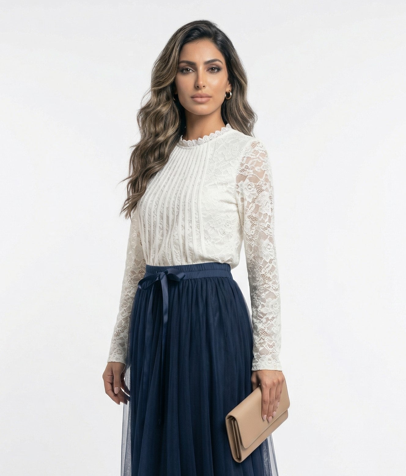 High Frill Collar Sheer Floral Lace Top with decorative pin-tucks details, mesh lining and long lace sleeve