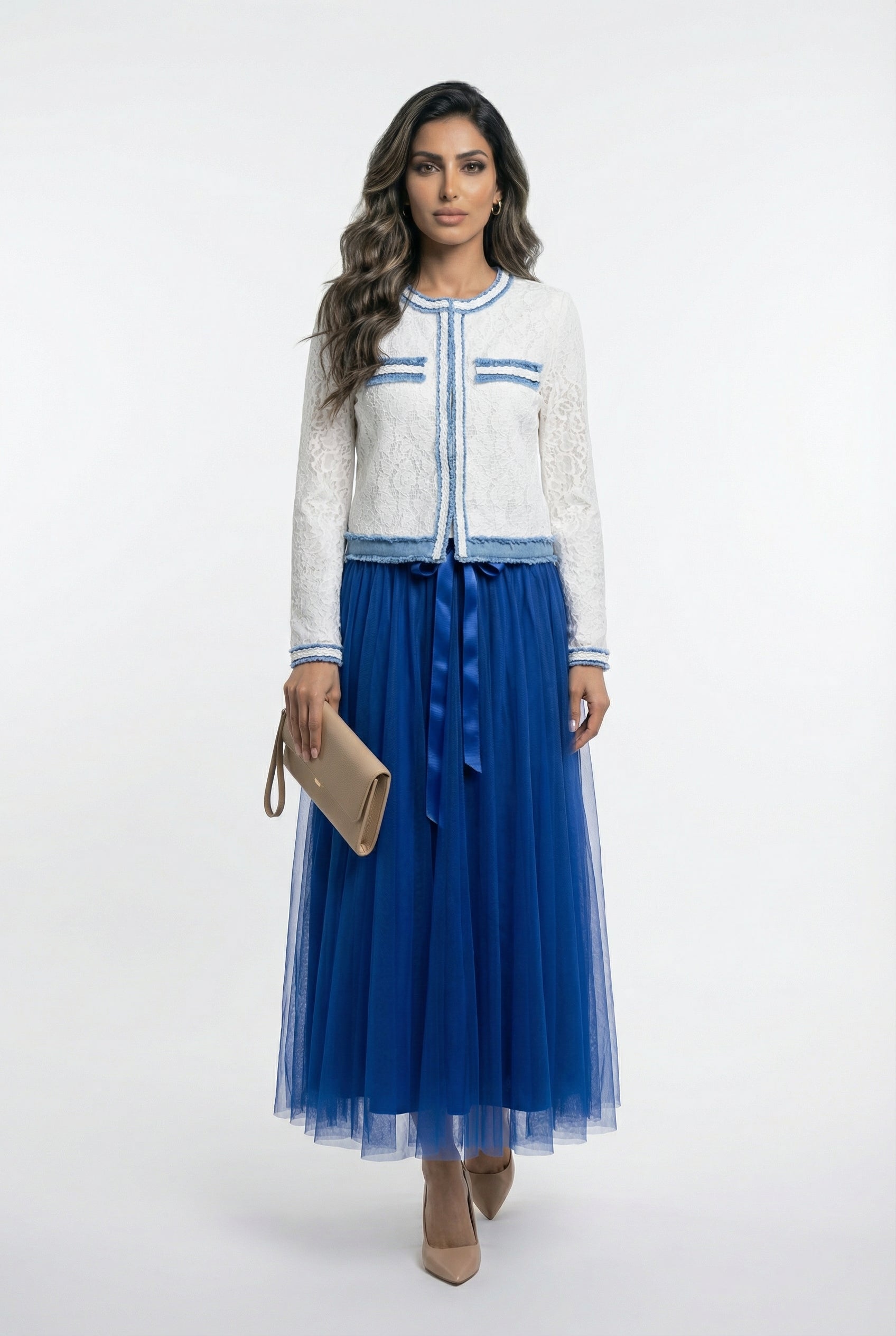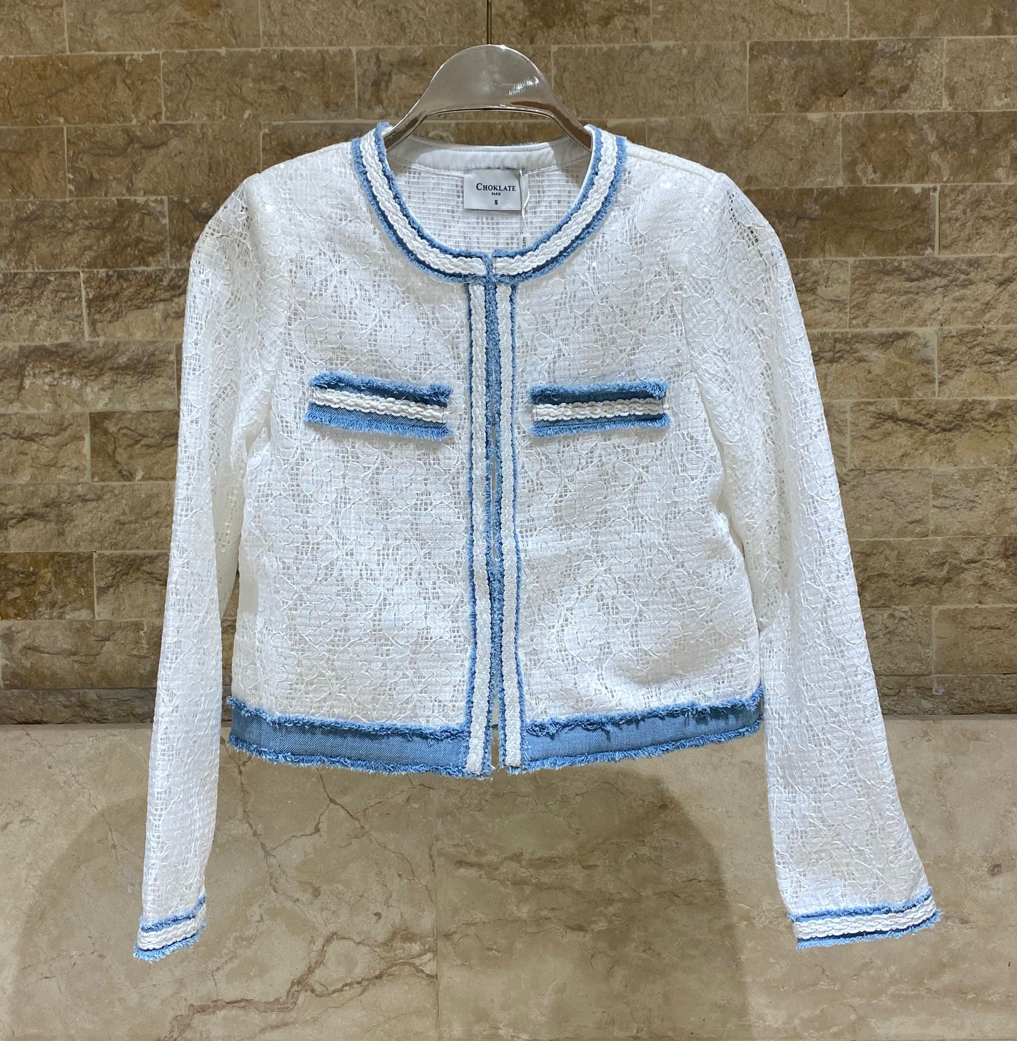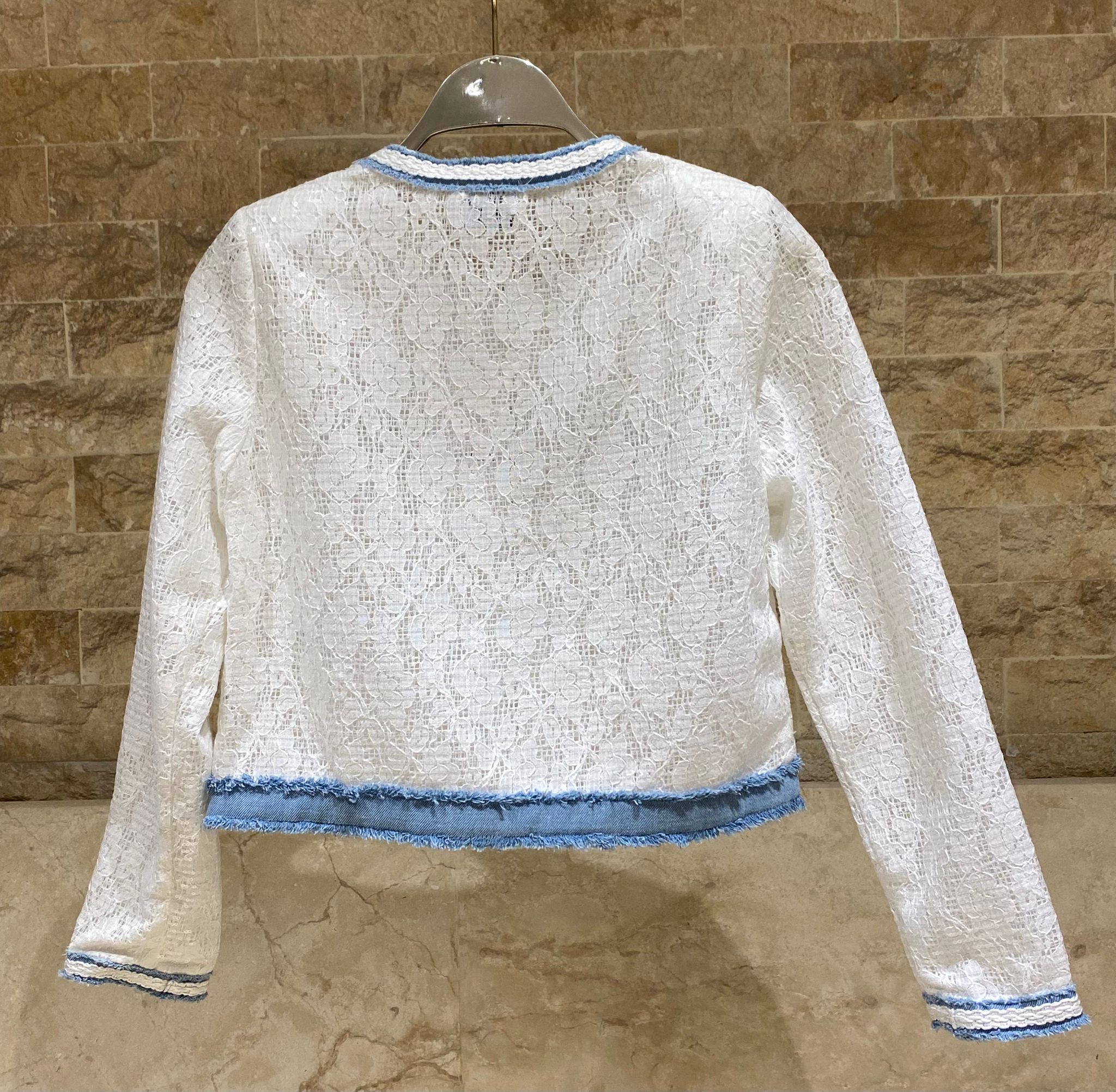Round Neckline Hook and Eye Lace Jacket with micro sequins, denim blue denim patch details and fringe trim, faux chest denim patch pocket trim and long sleeve with denim cuff details