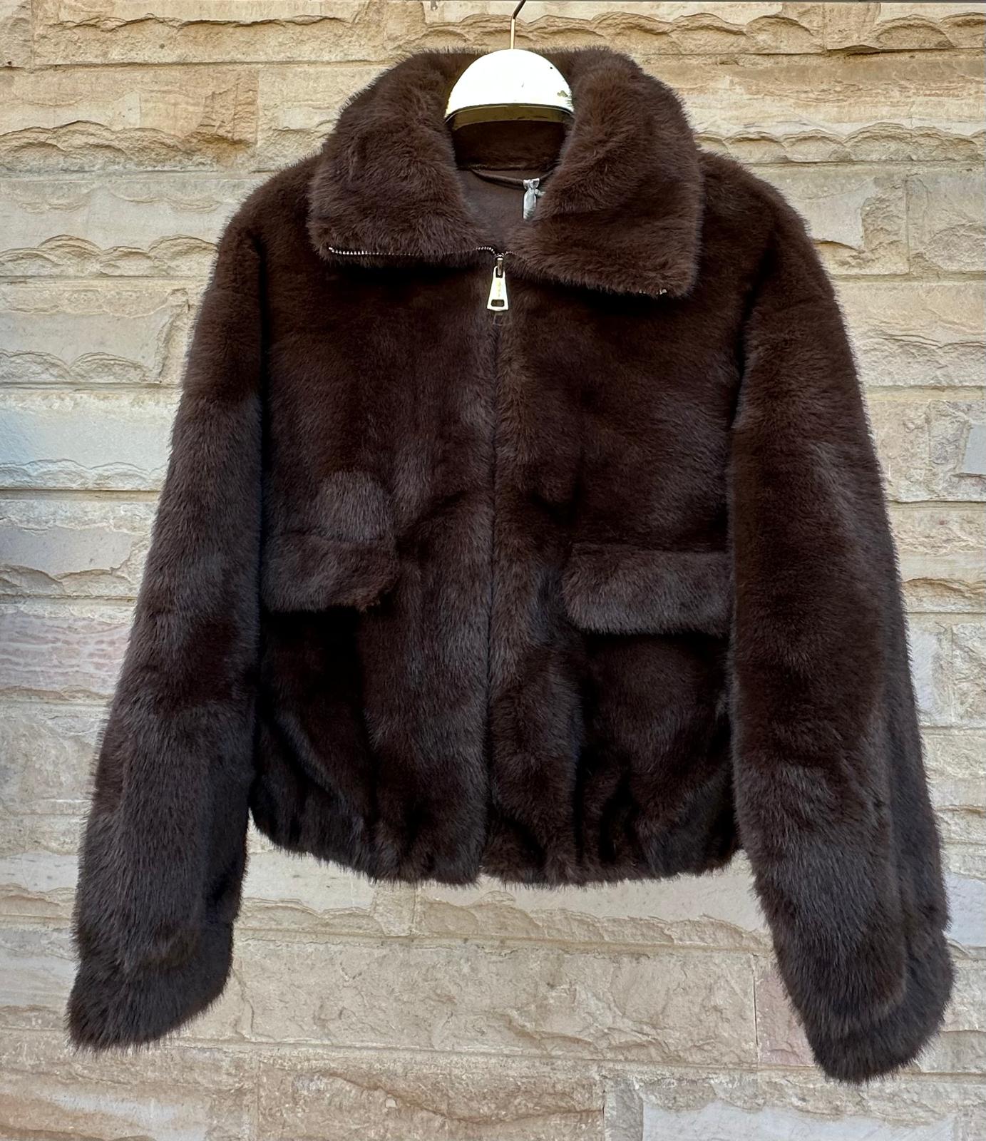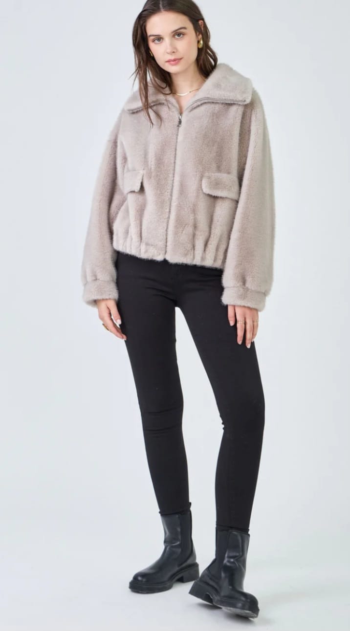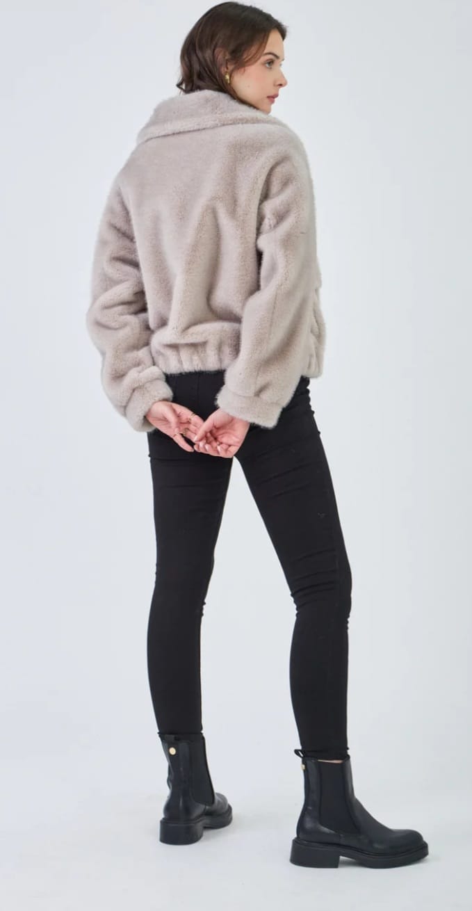 Zippered High Collared Oversized Faux Fur Jacket with flap pockets, drop shoulder, slightly elasticated waist and long puffed sleeve with tight cuff