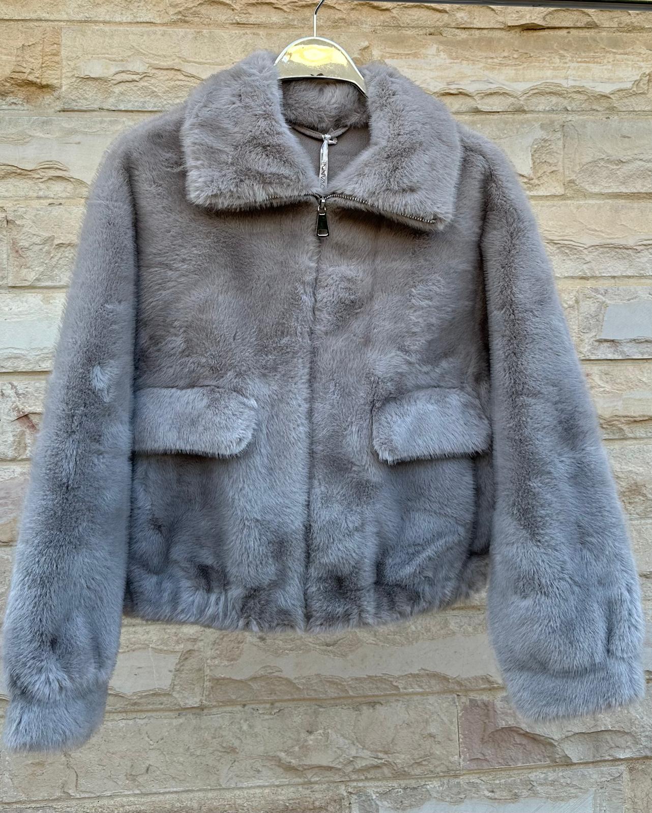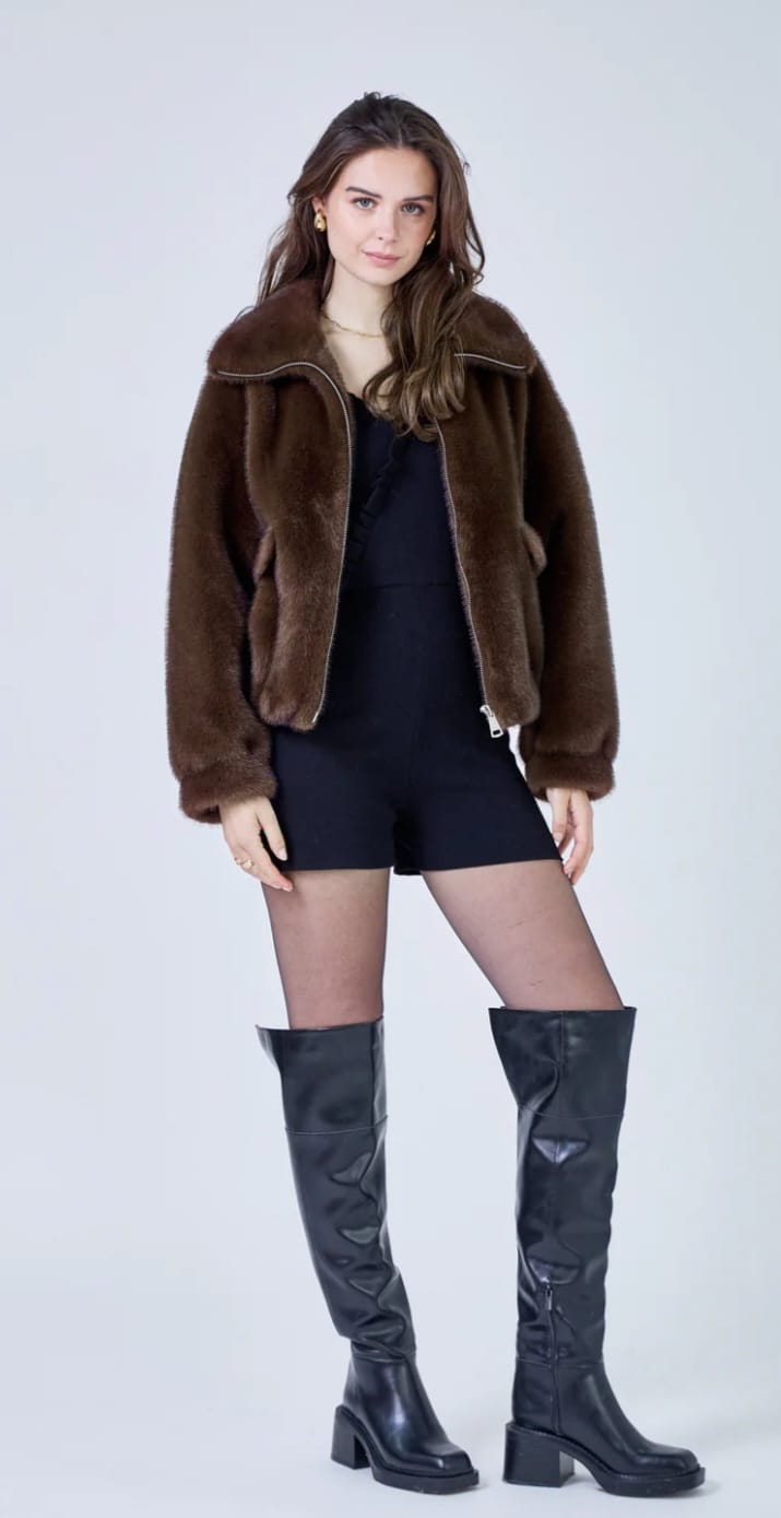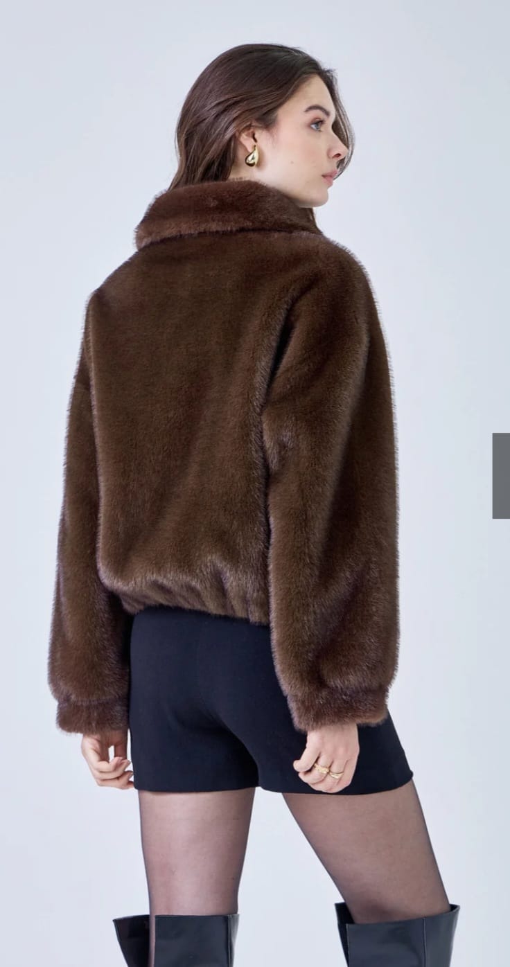 Zippered High Collared Oversized Faux Fur Jacket with flap pockets, drop shoulder, slightly elasticated waist and long puffed sleeve with tight cuff