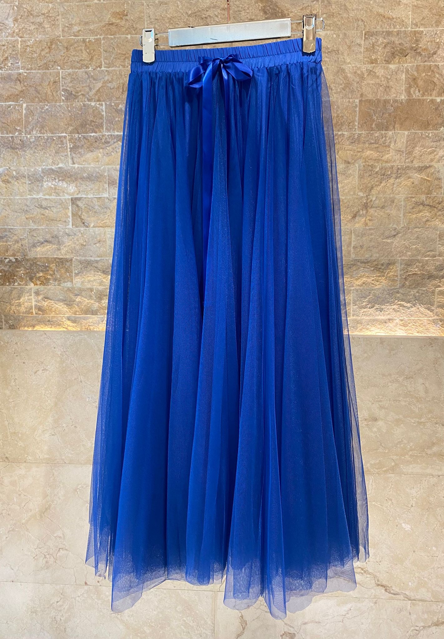 Elastic Waistband High Waist Long Tulle Skirt with decorative ribbon tie front waist details