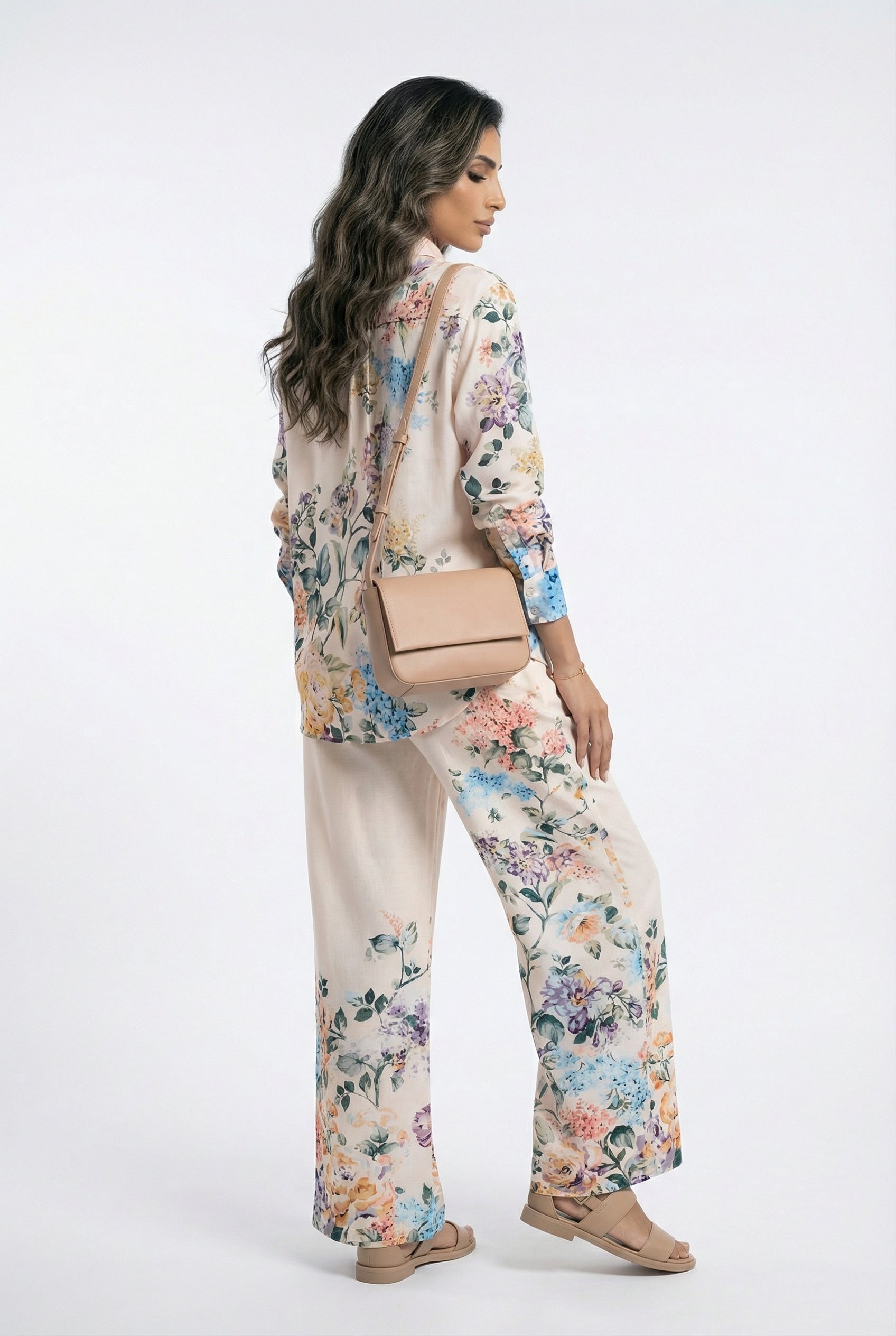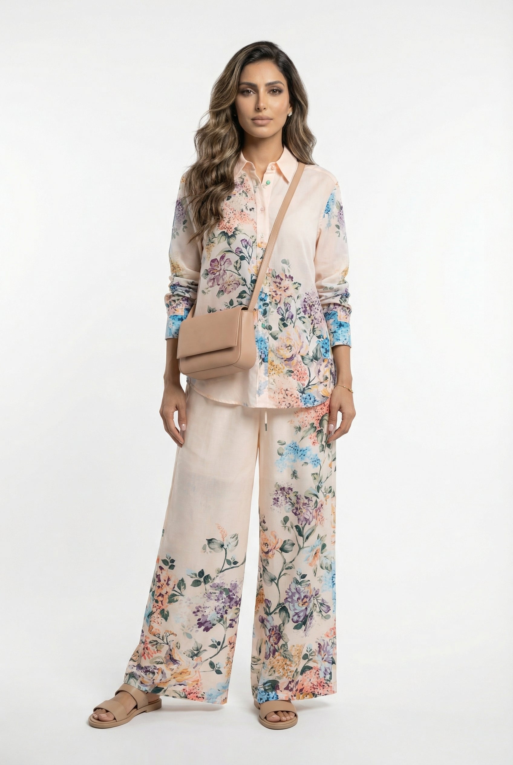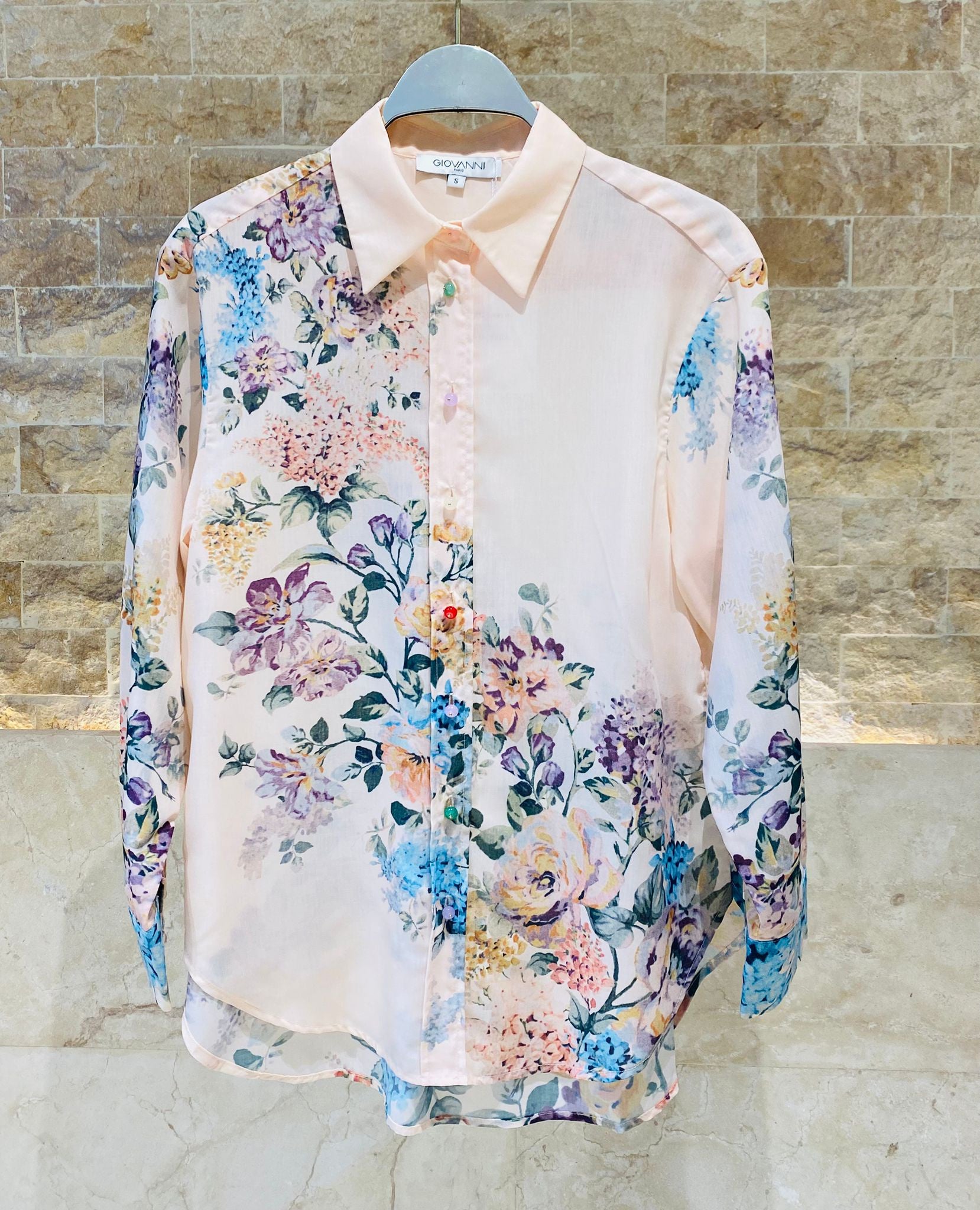 Buttoned Classic Collared Floral Print Oversized Fit Semi Sheer Shirt with multi color beads buttons, curved hem and long sleeve with buttoned cuff