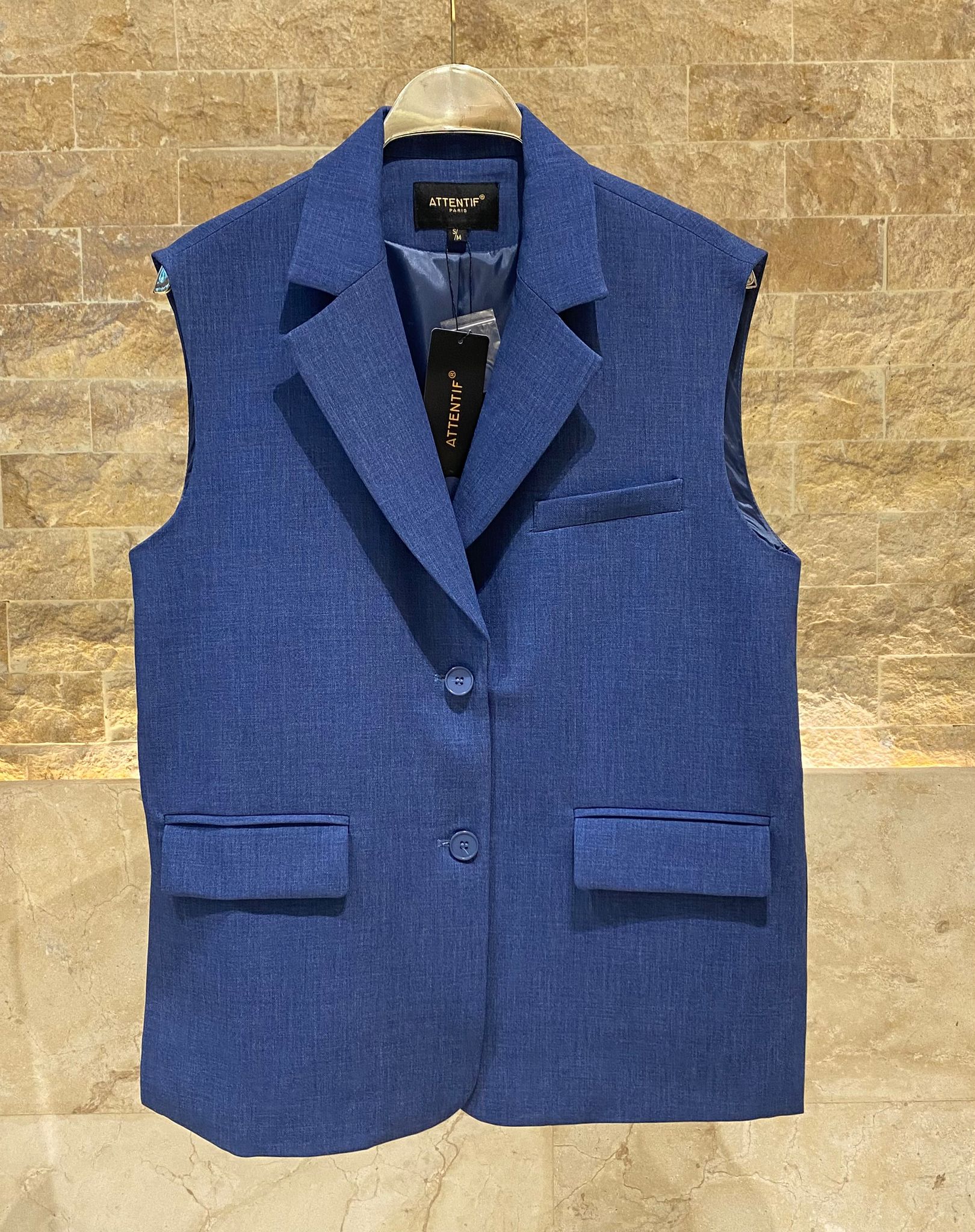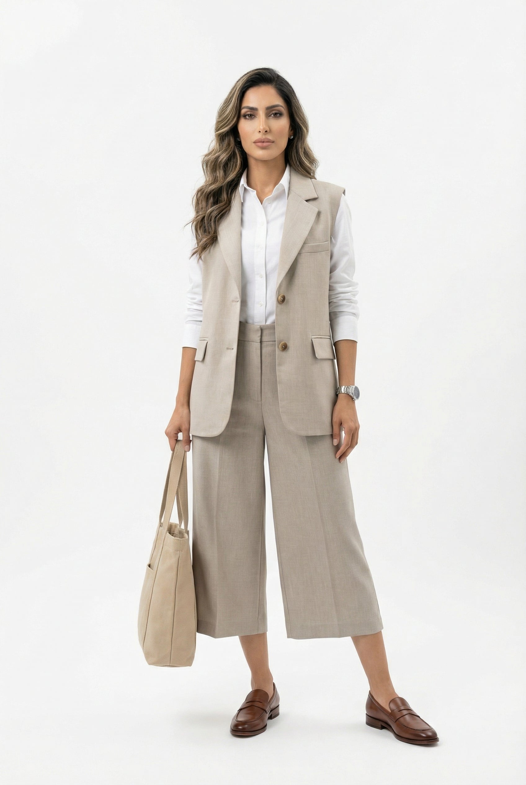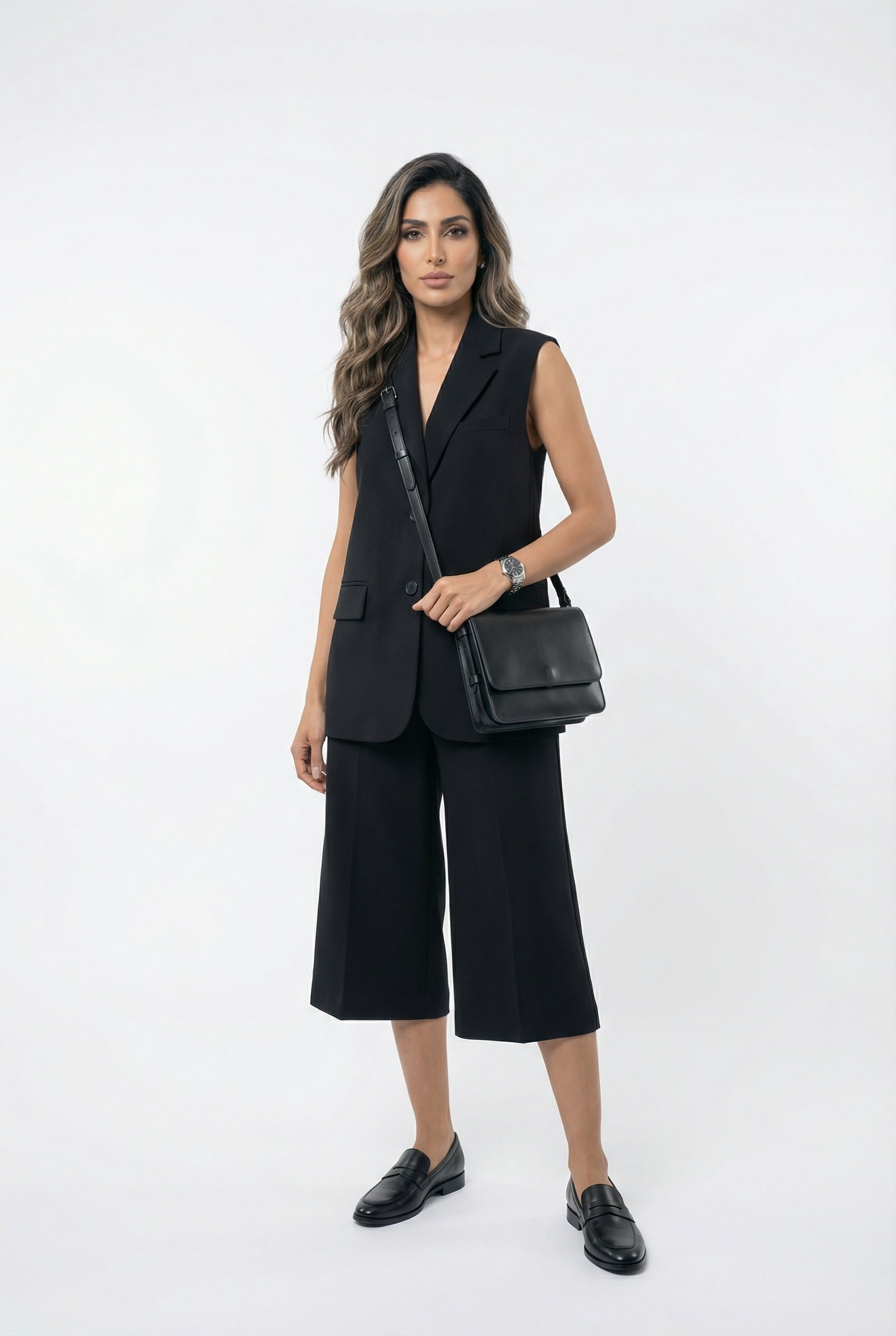 Notched Lapel Two Buttoned Oversized Tailored Vest with flap pockets and size slit with matching Buttoned Zippered Wide Leg High Rise Bermuda Short with side pockets and back welt faux pocket details