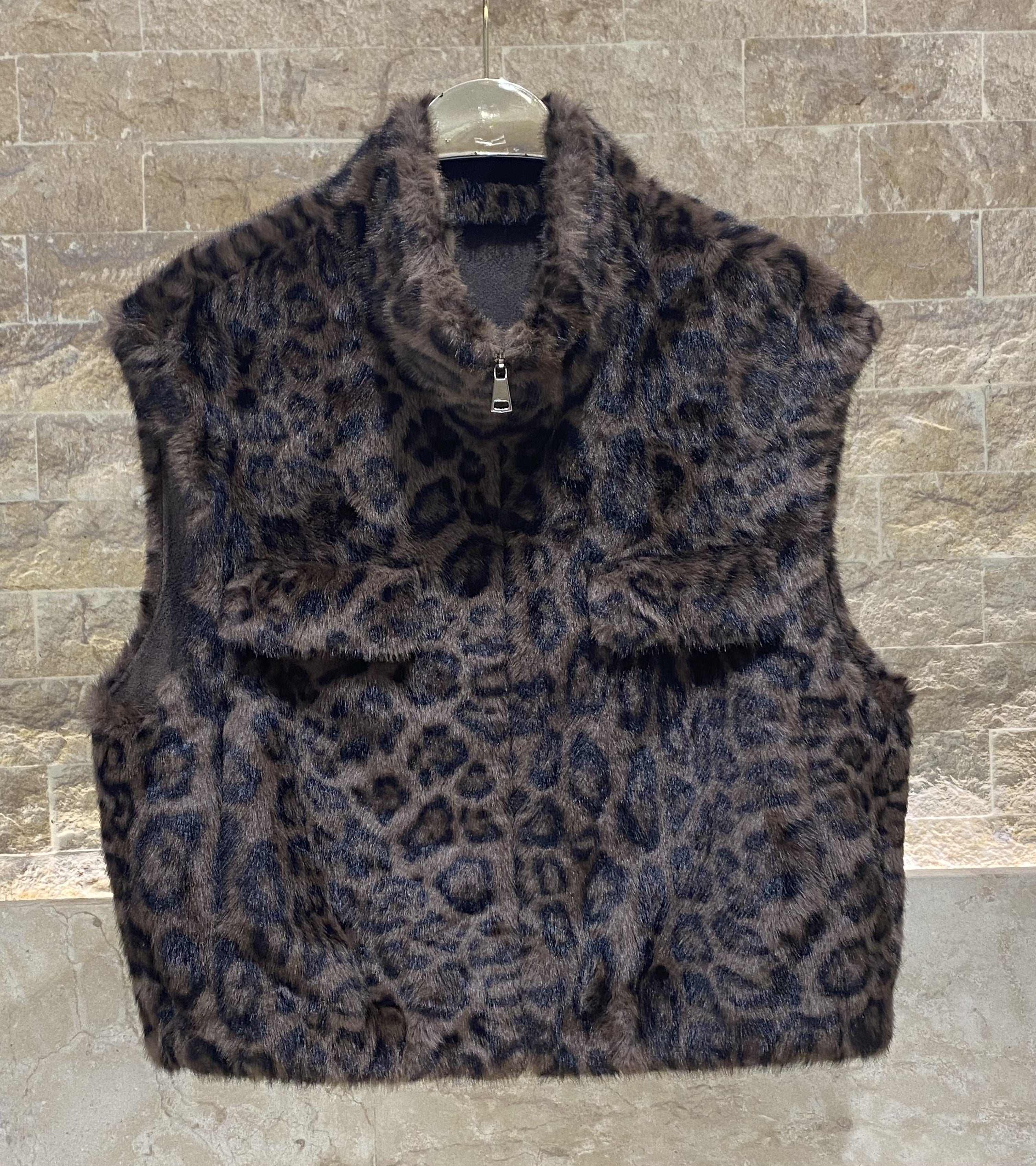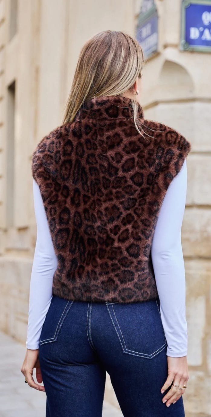 Zippered Closure High Collared Leopard Faux Fur Vest with faux flap details, side pockets and elastic hem details