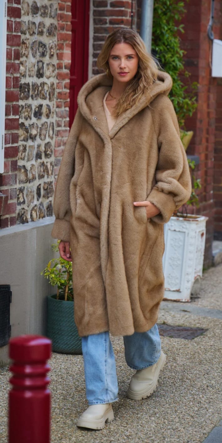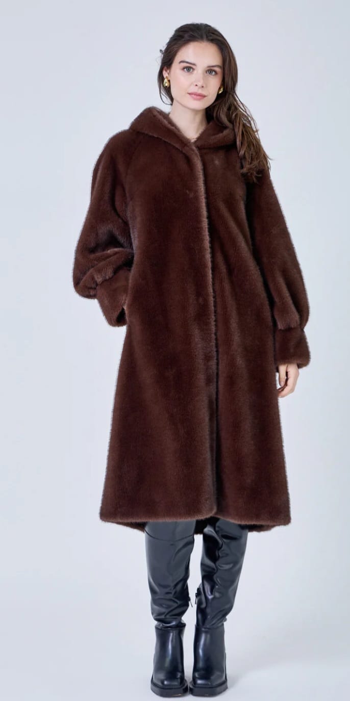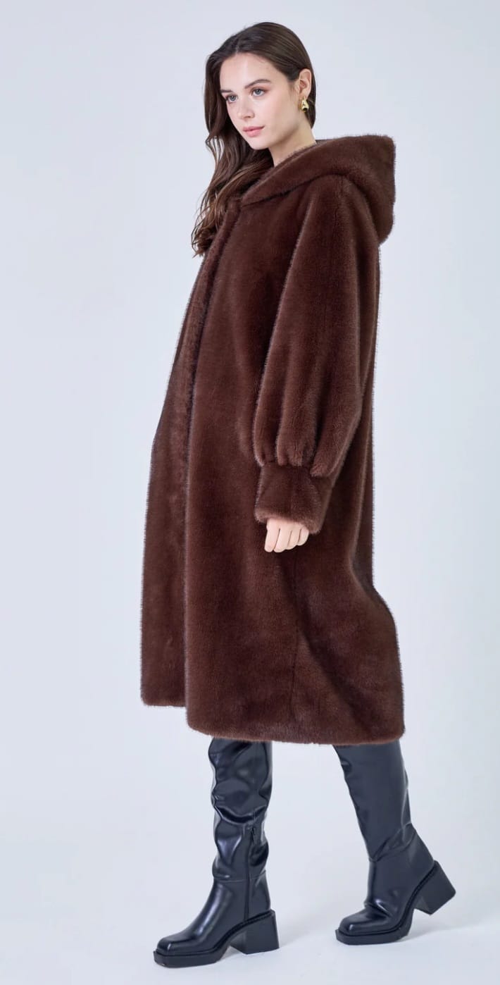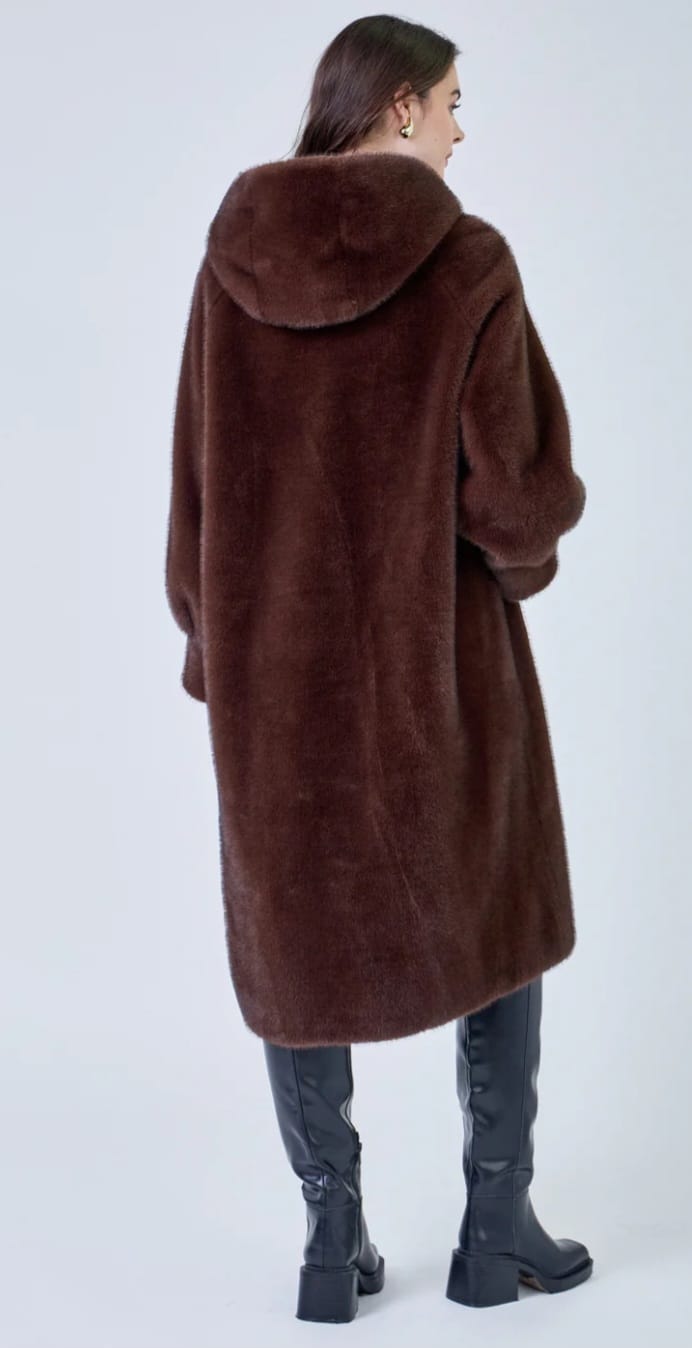 Isabella معطف طويل من الفرو الصناعي بغطاء للرأس