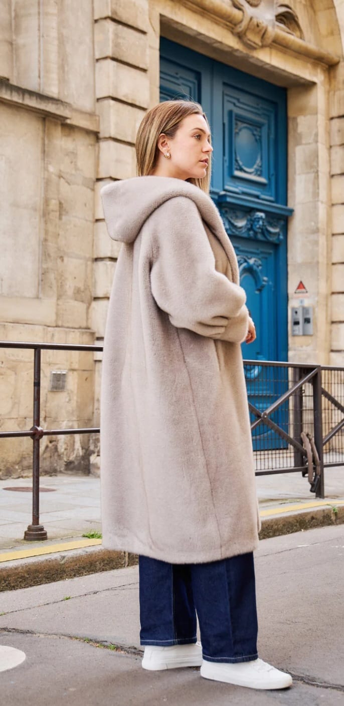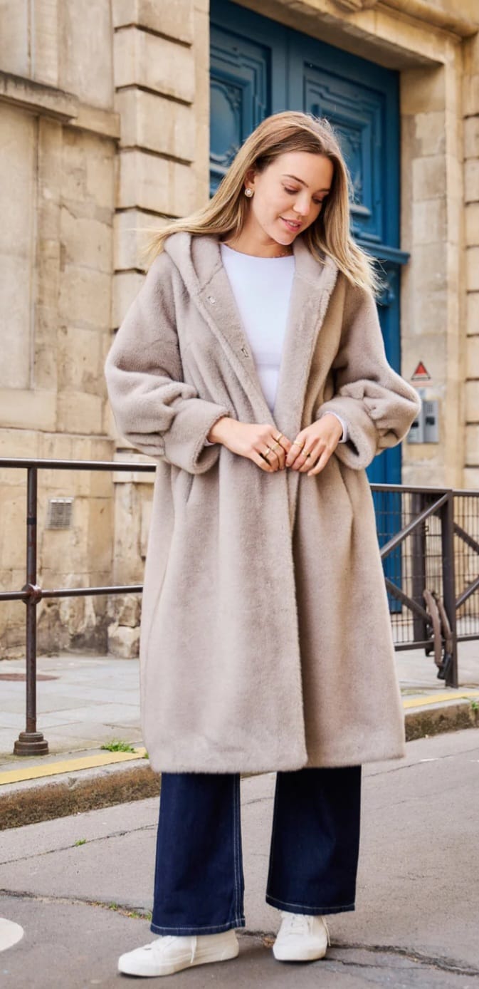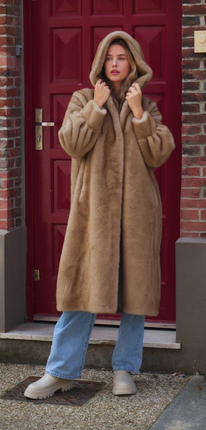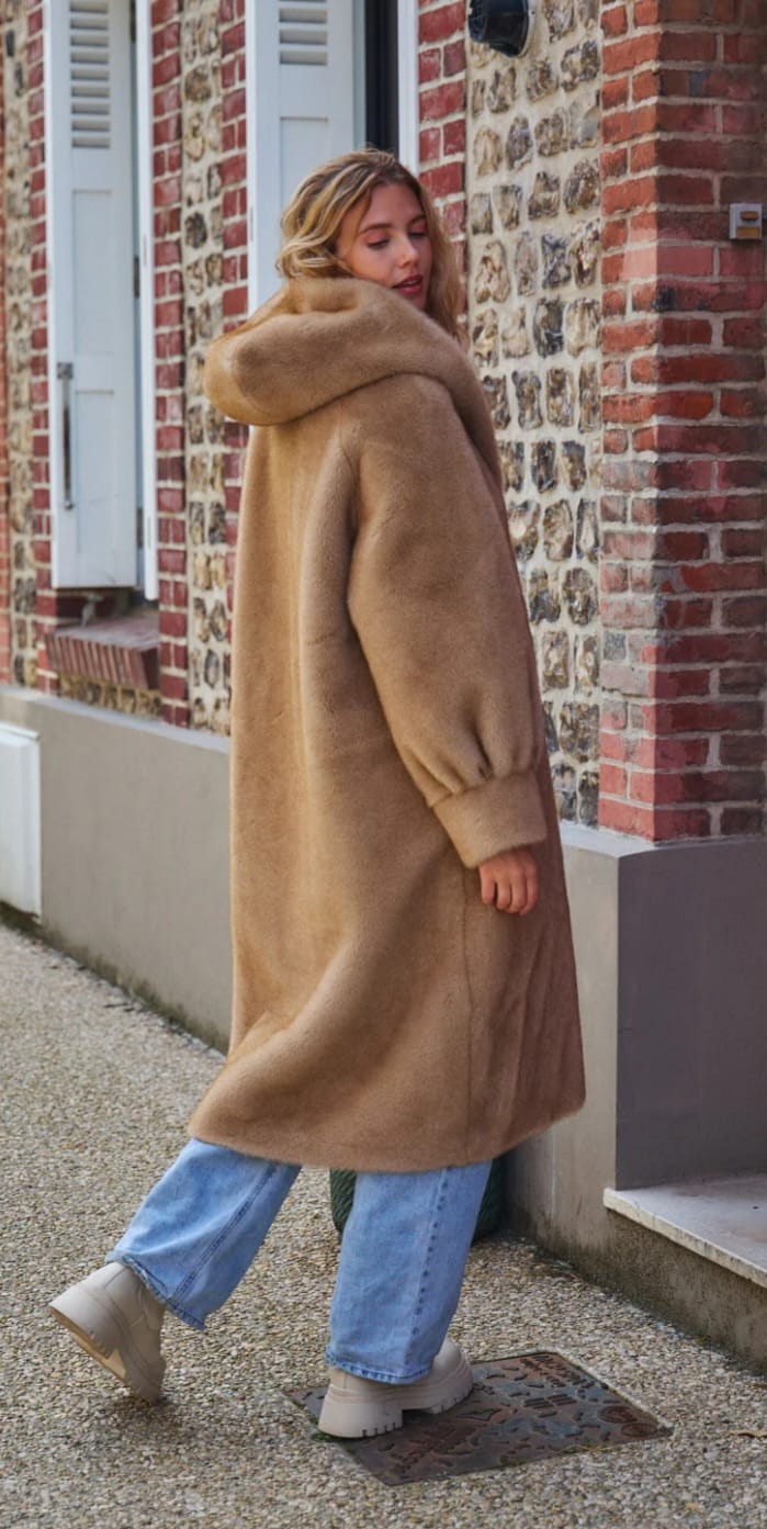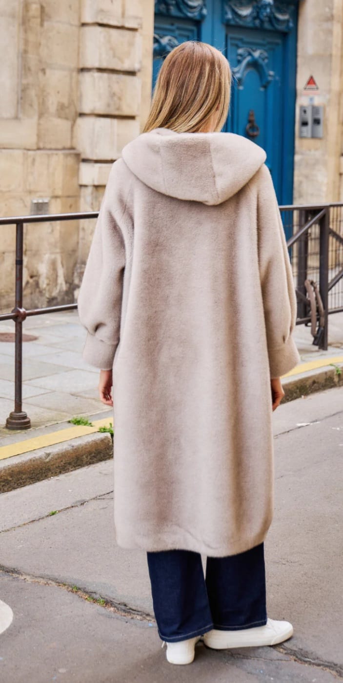 Isabella معطف طويل من الفرو الصناعي بغطاء للرأس
