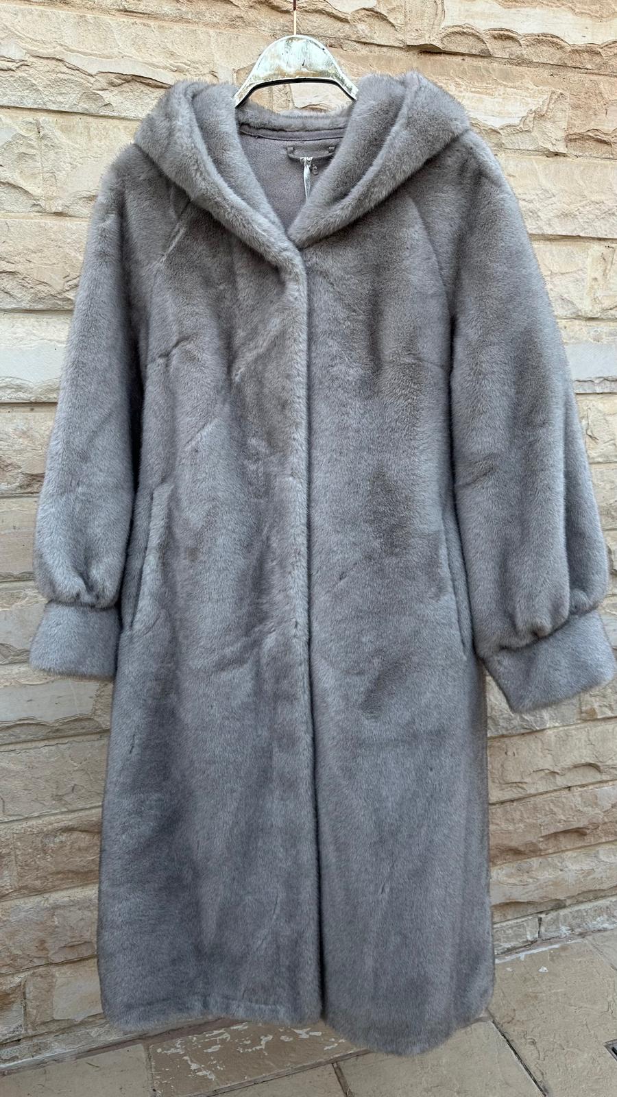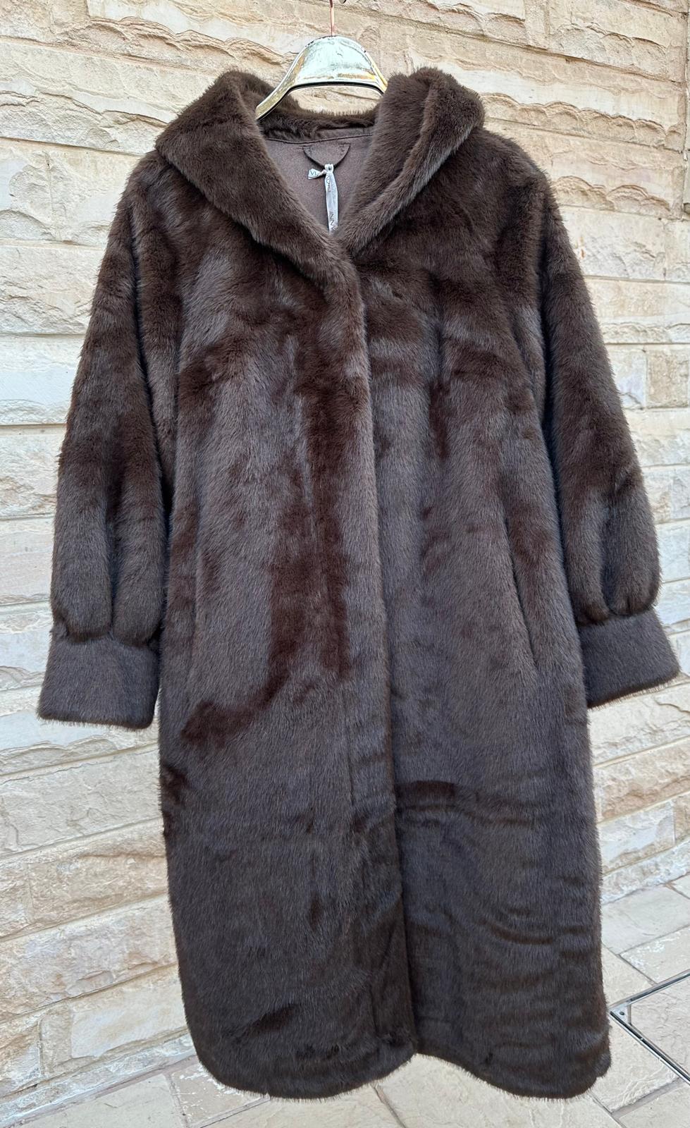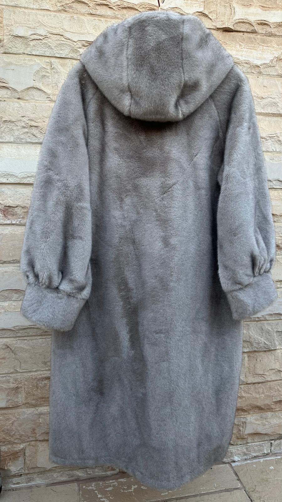 Hook Closure Hooded Oversized Cut Faux Fur Long Coat with slip side pockets and long wide sleeve with cuff