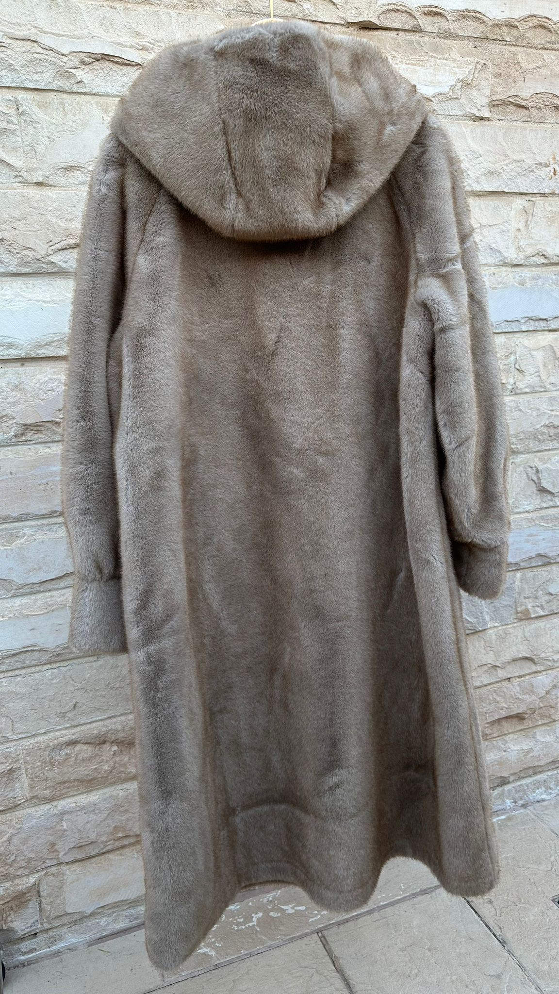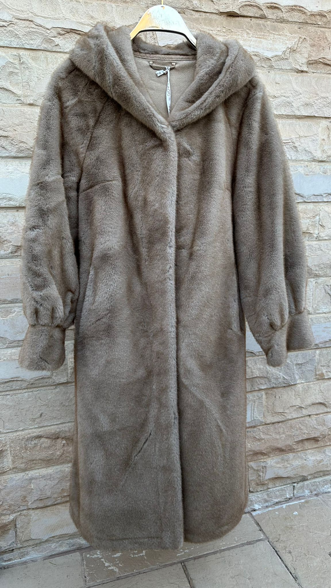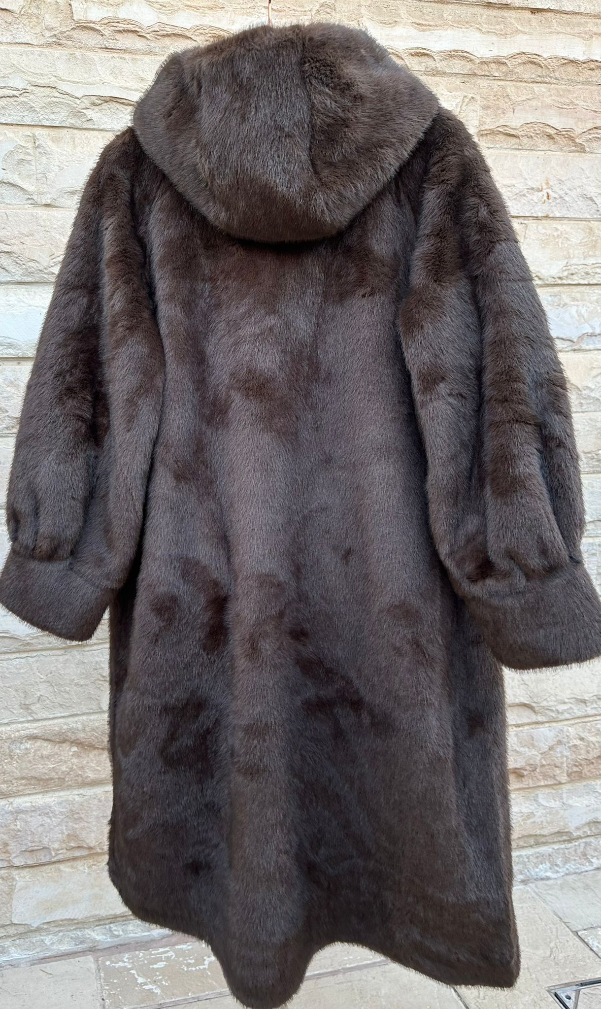 Hook Closure Hooded Oversized Cut Faux Fur Long Coat with slip side pockets and long wide sleeve with cuff