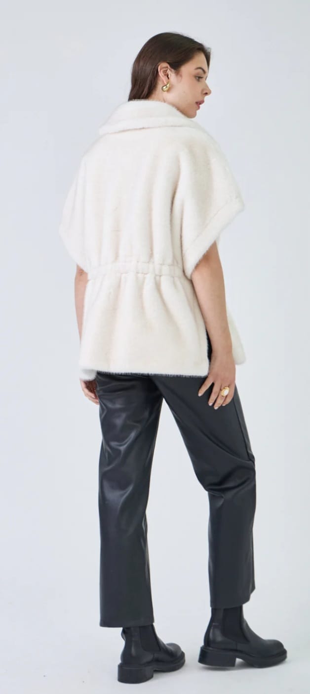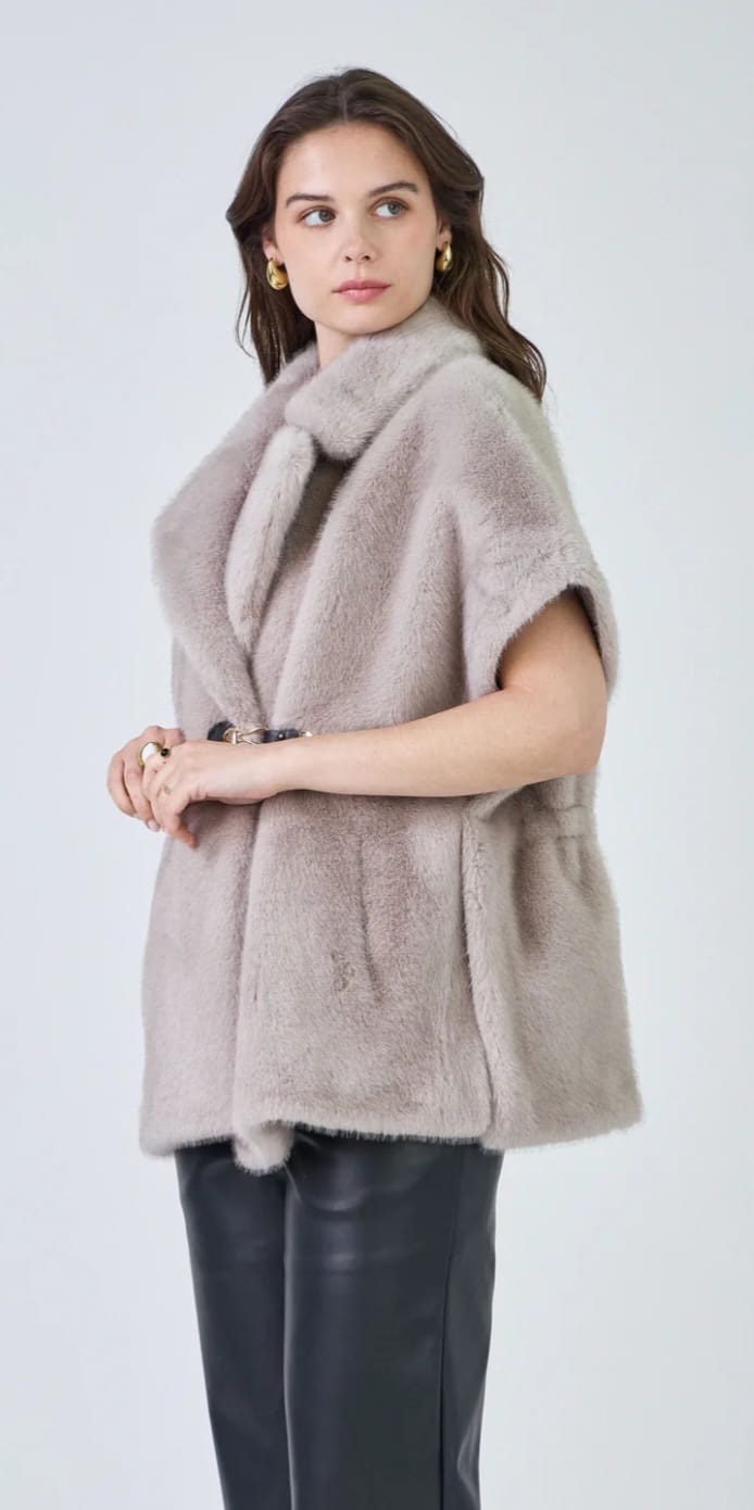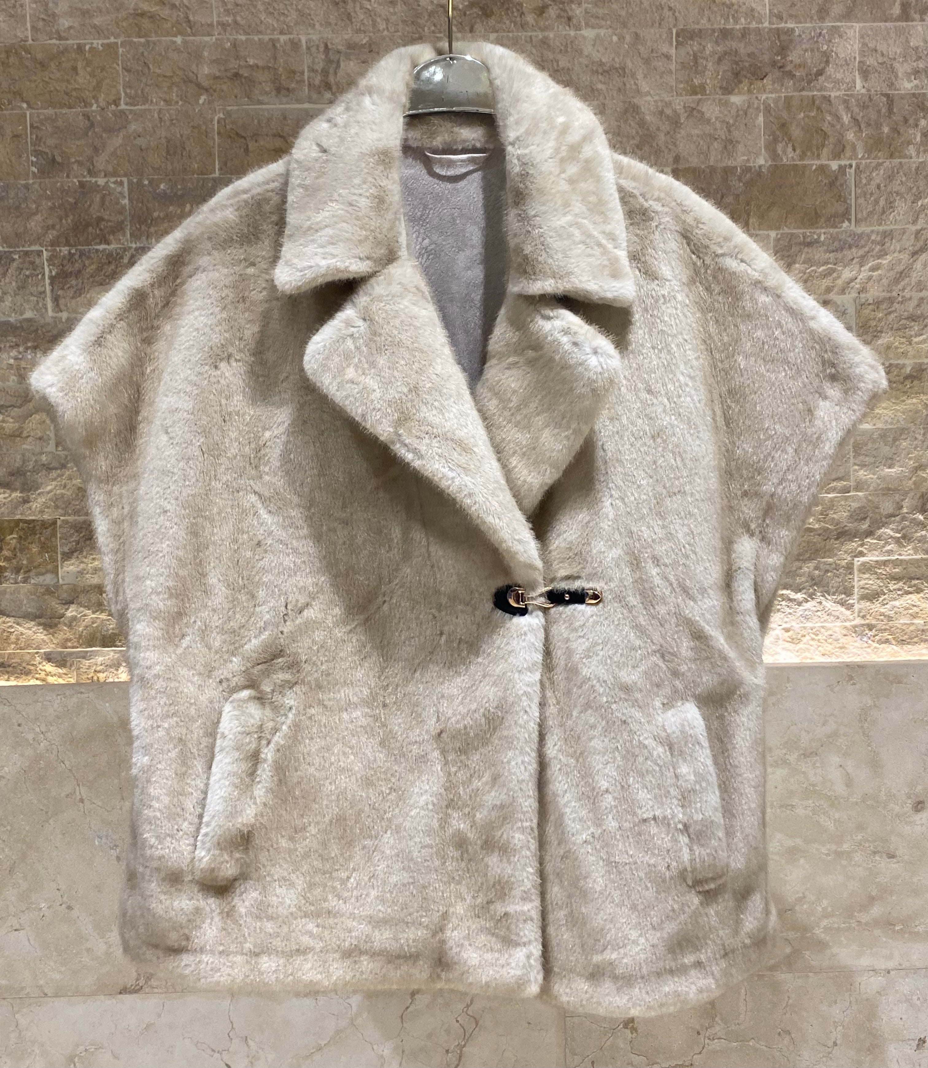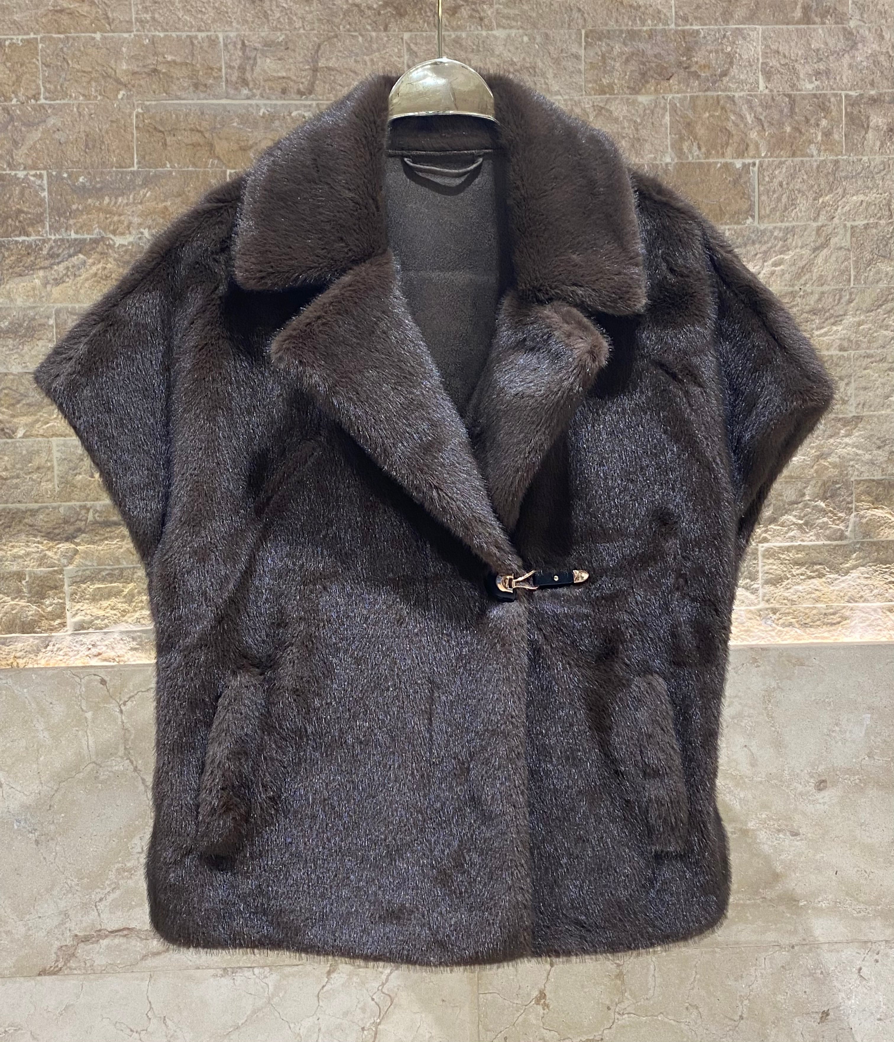 Lapel Soft High Collared Single Strap Buttoned Fitted Cut Faux Fur Vest with slip side pockets, adjustable waist back details and short sleeve