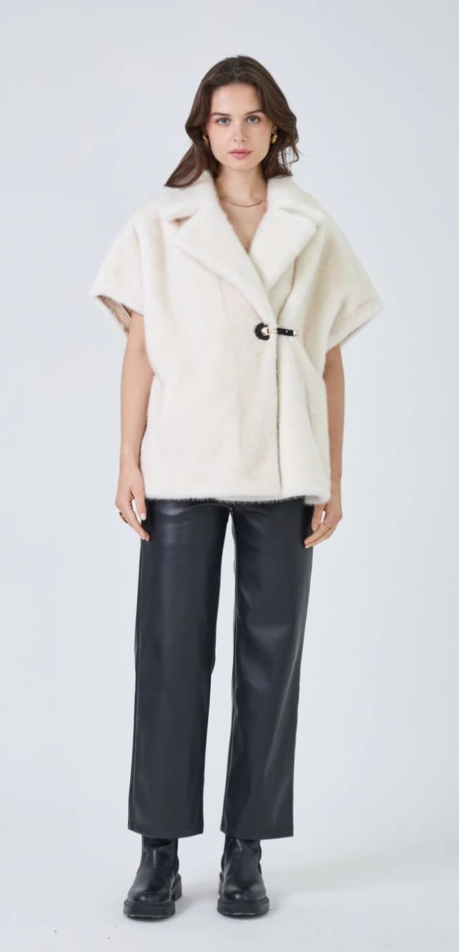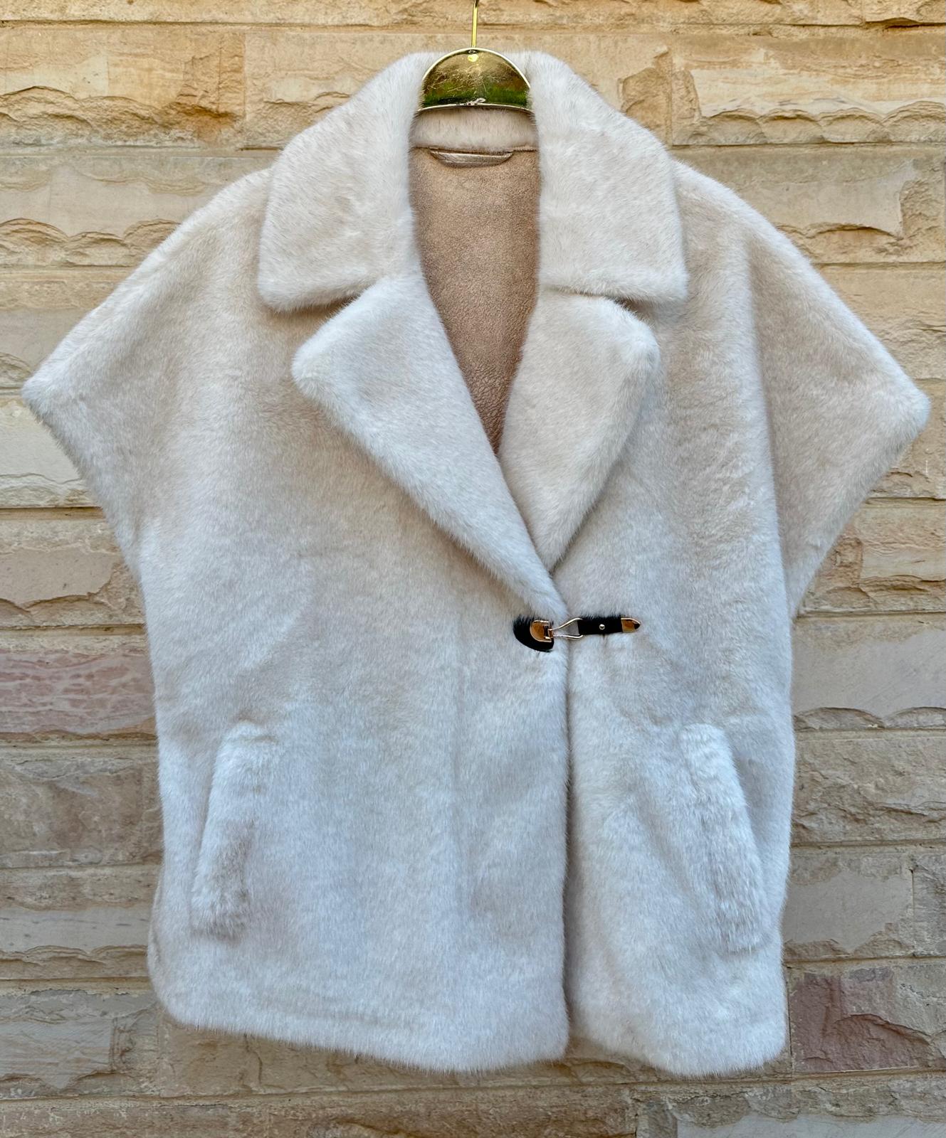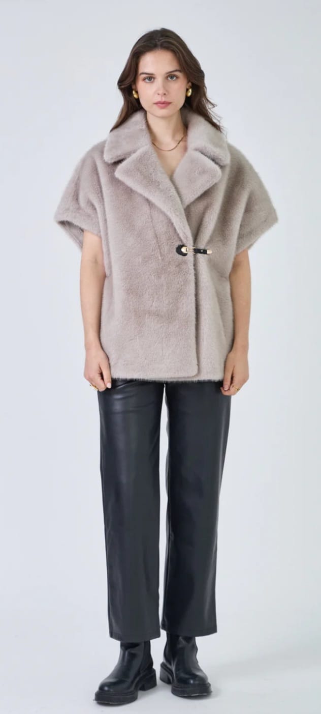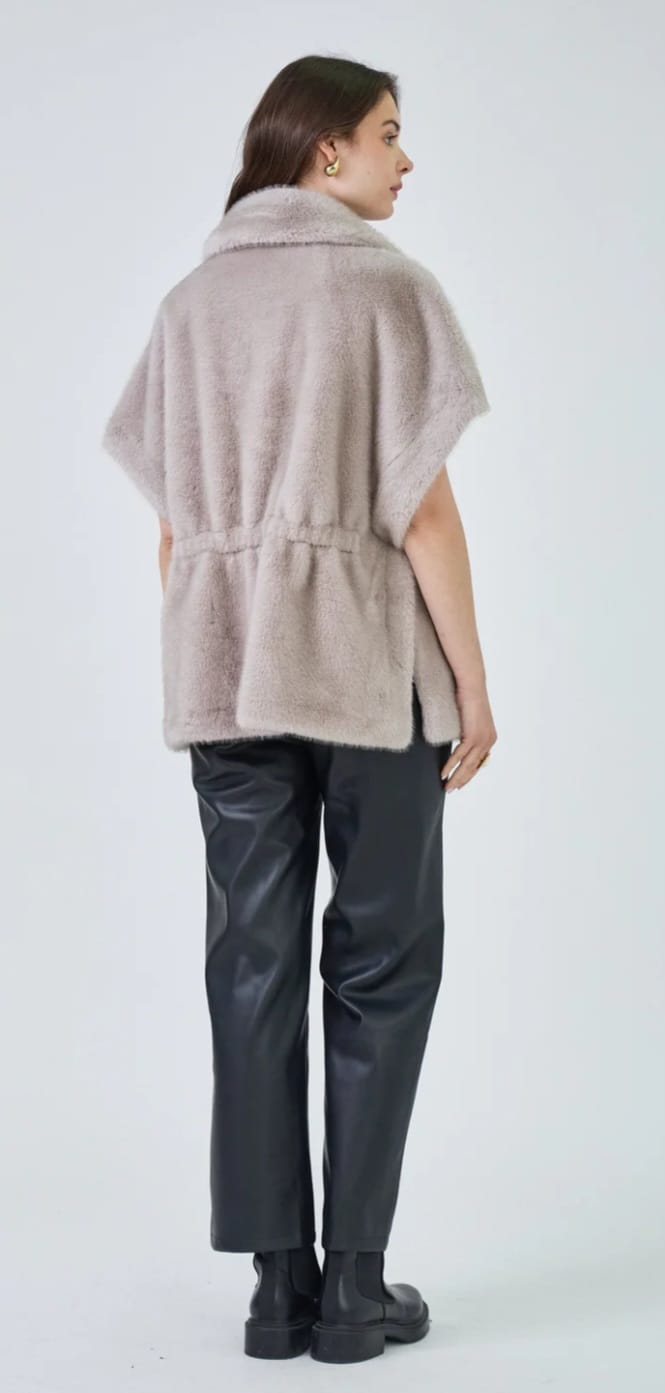 Lapel Soft High Collared Single Strap Buttoned Fitted Cut Faux Fur Vest with slip side pockets, adjustable waist back details and short sleeve