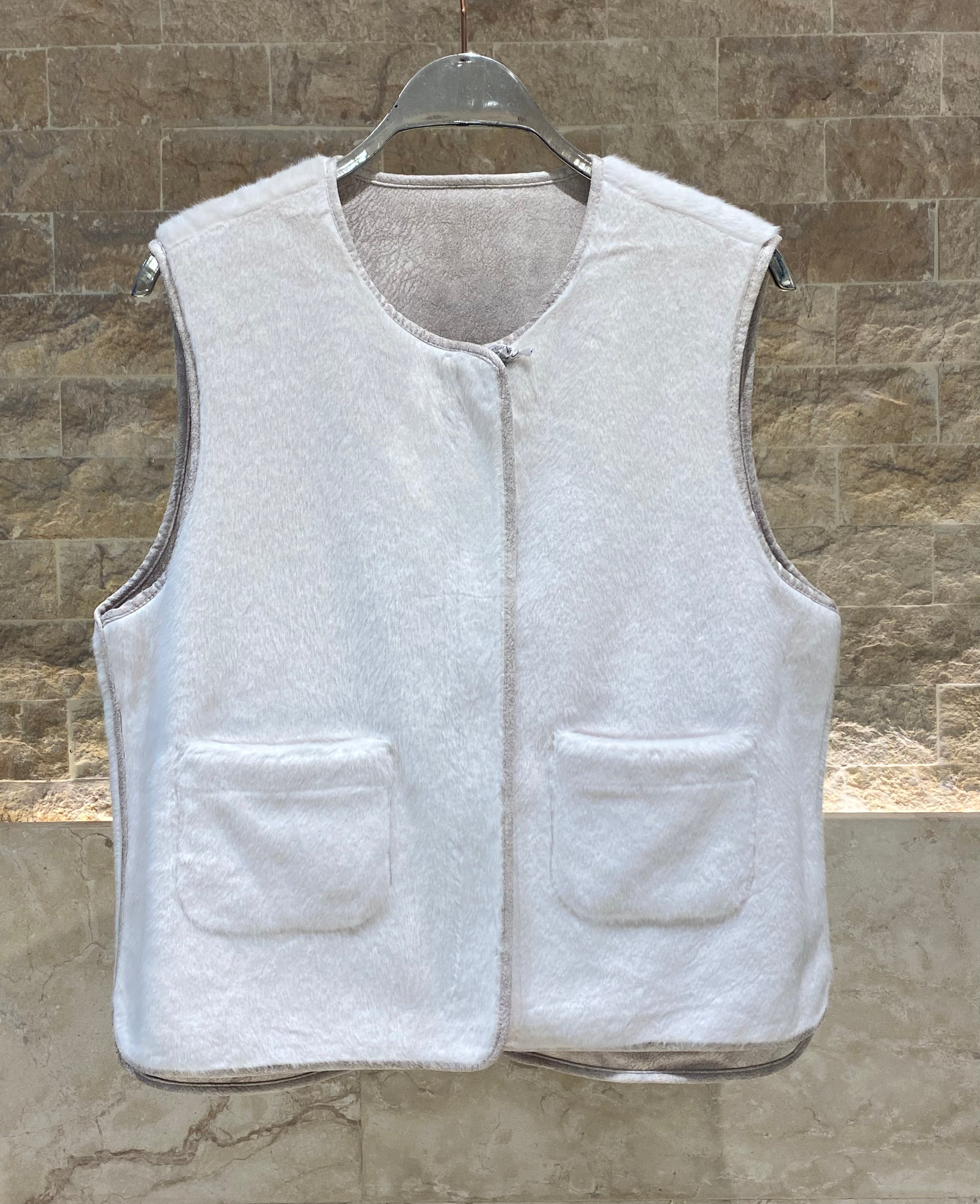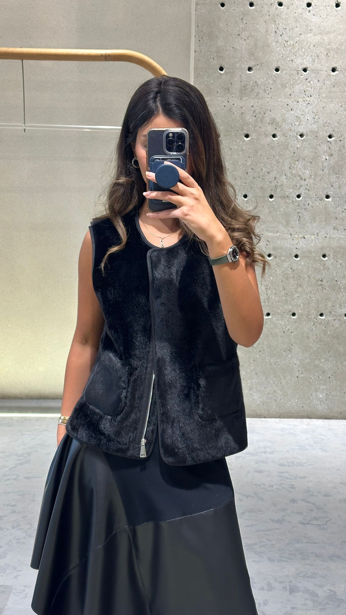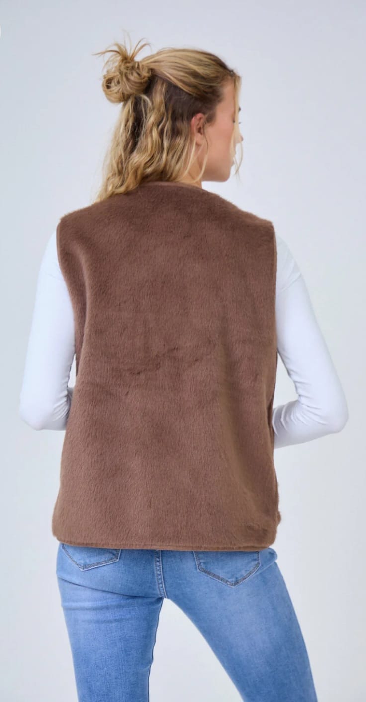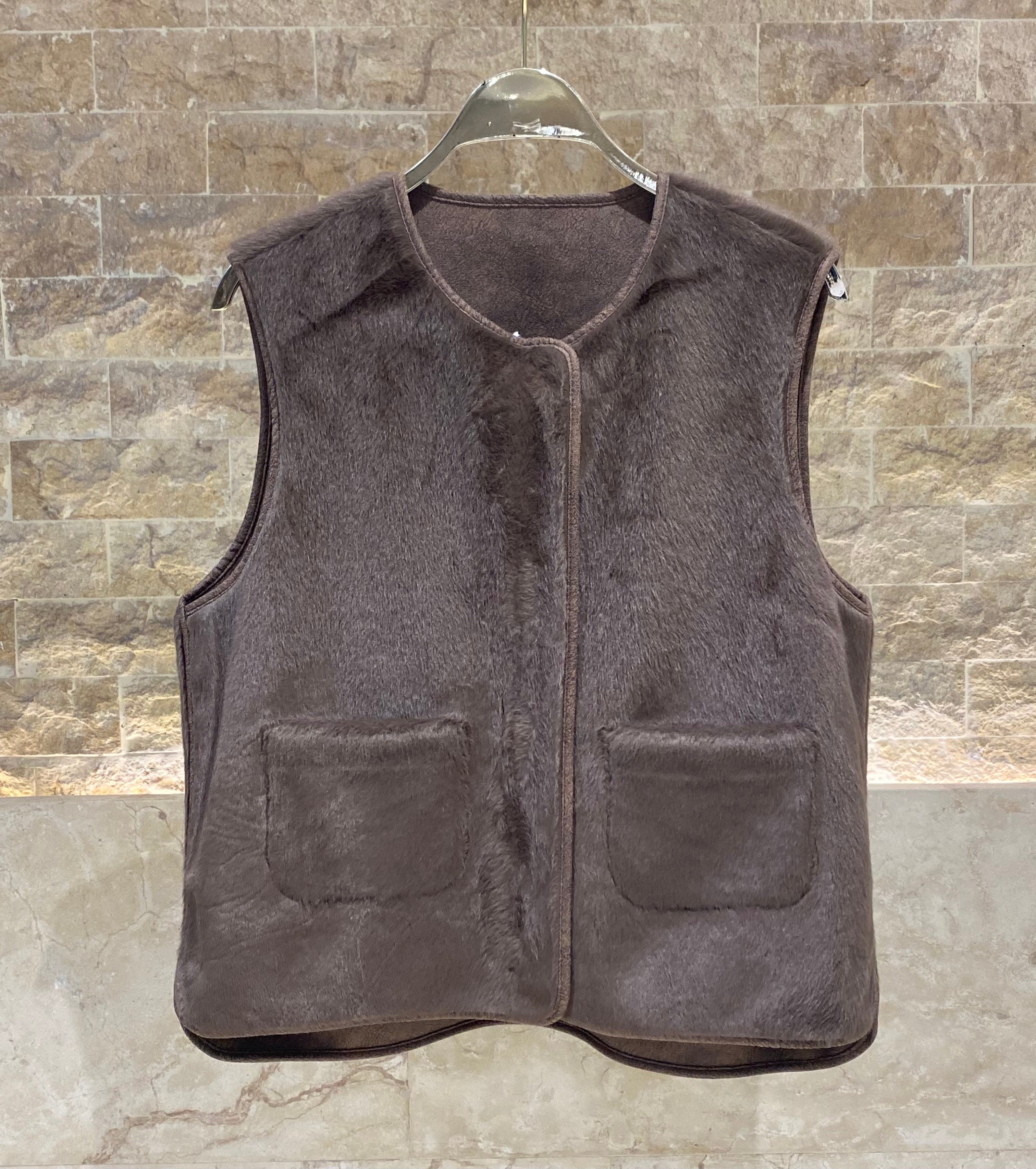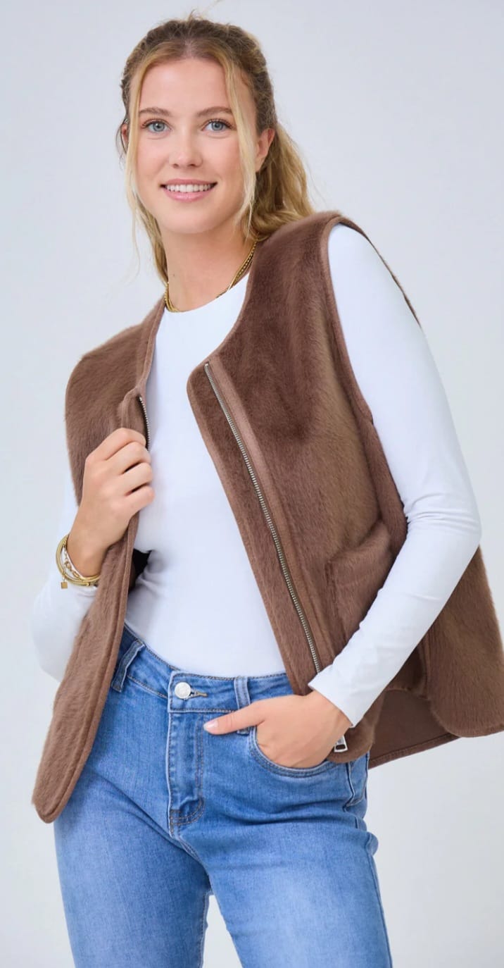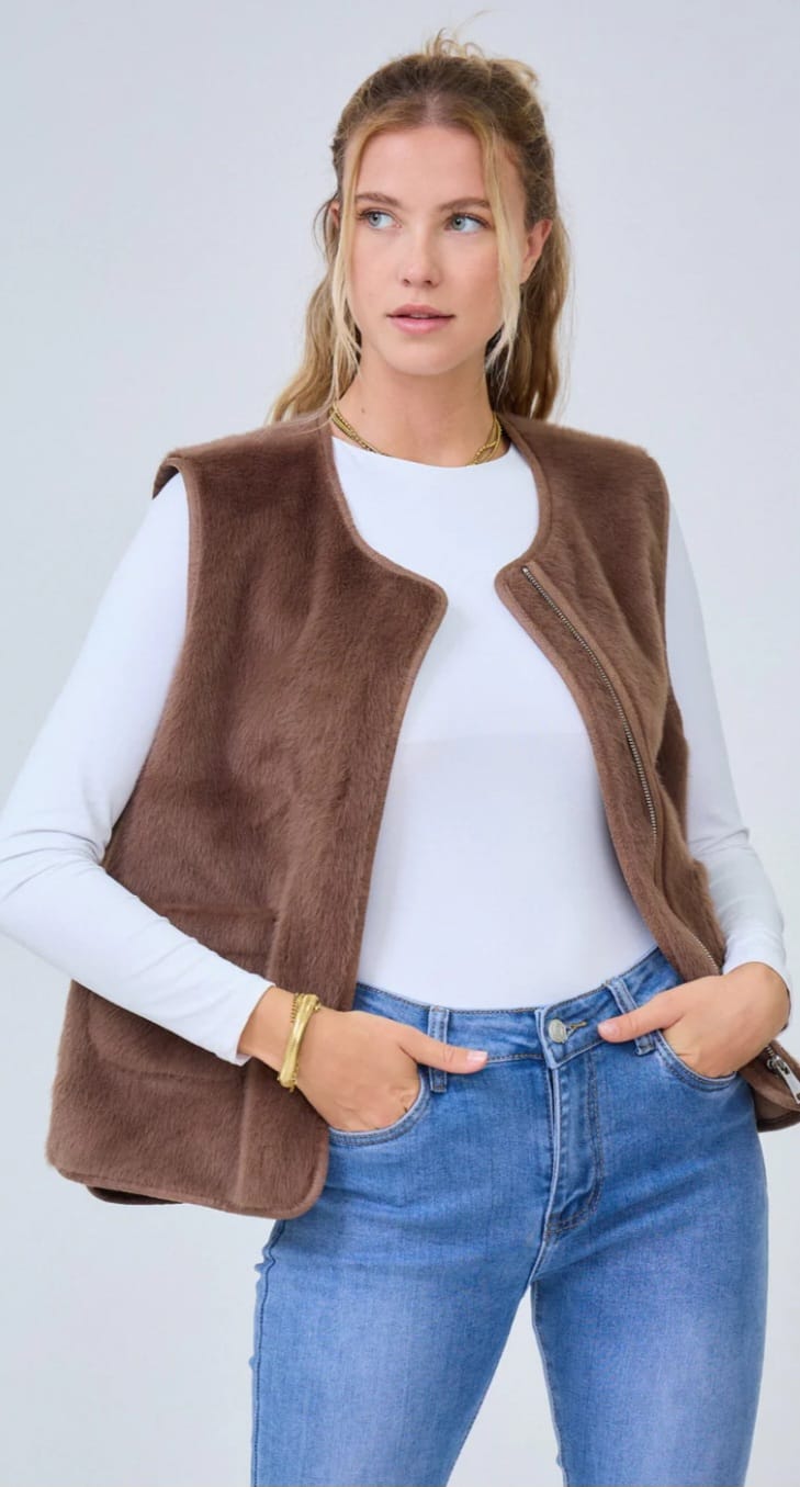 Round Neck Placket Zippered Faux Fur Vest with patch pockets