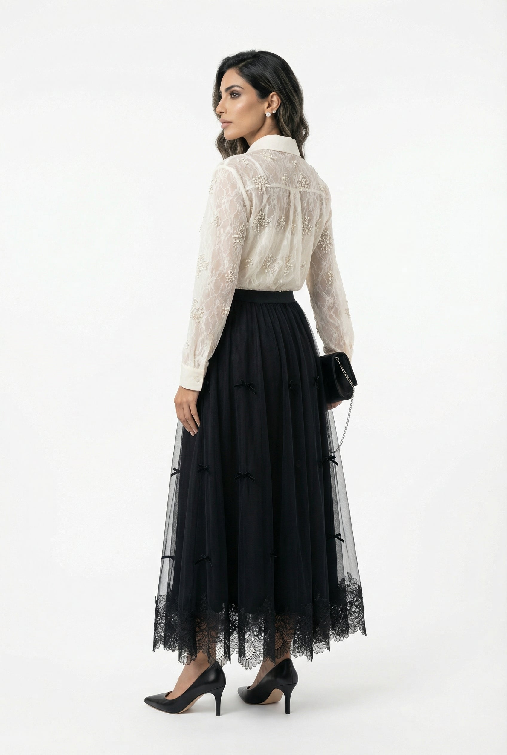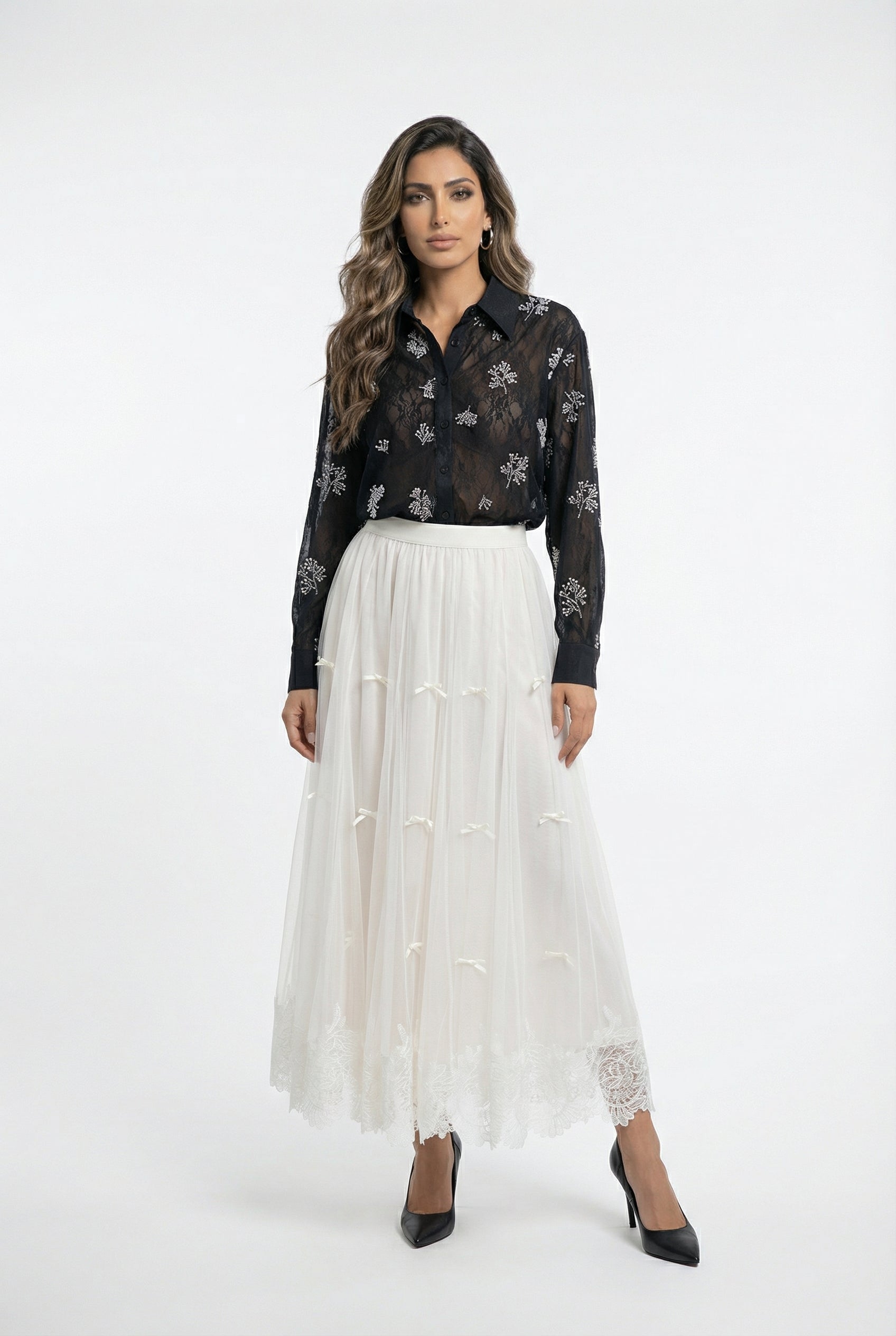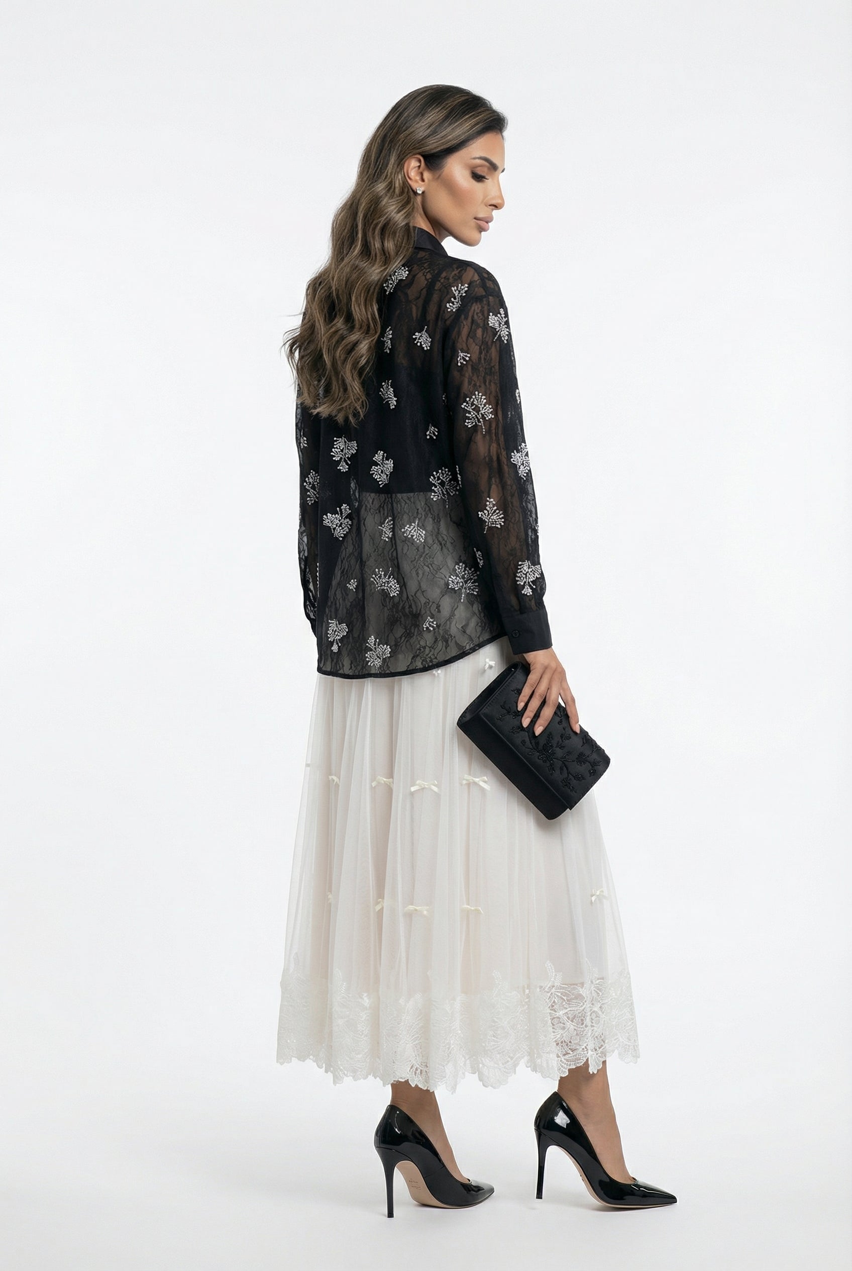 Buttoned Pointed Collared Long Back Sheer Shirt with beads/pearls detailed, floral lace body lining and long sleeve with buttoned cuff