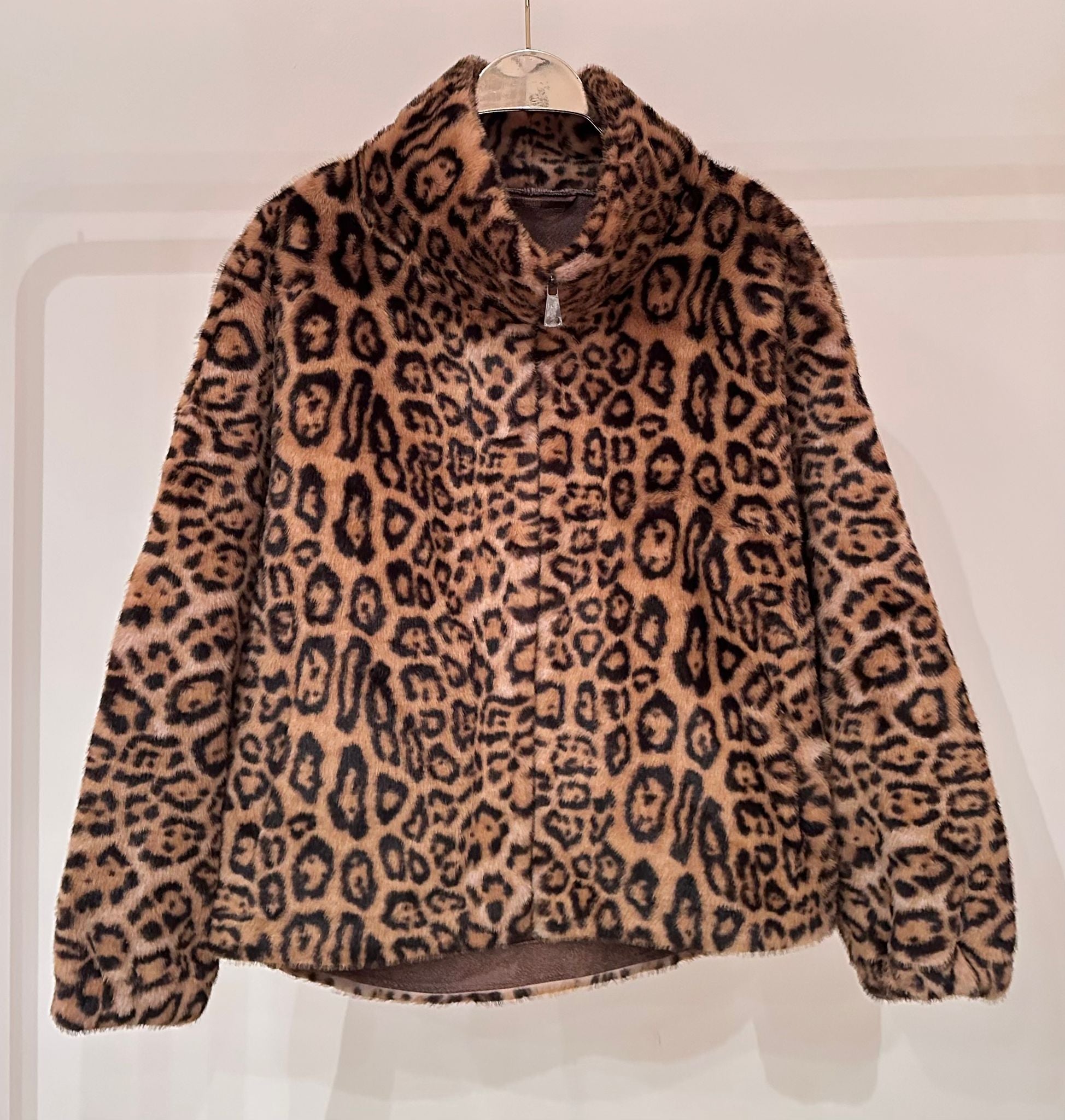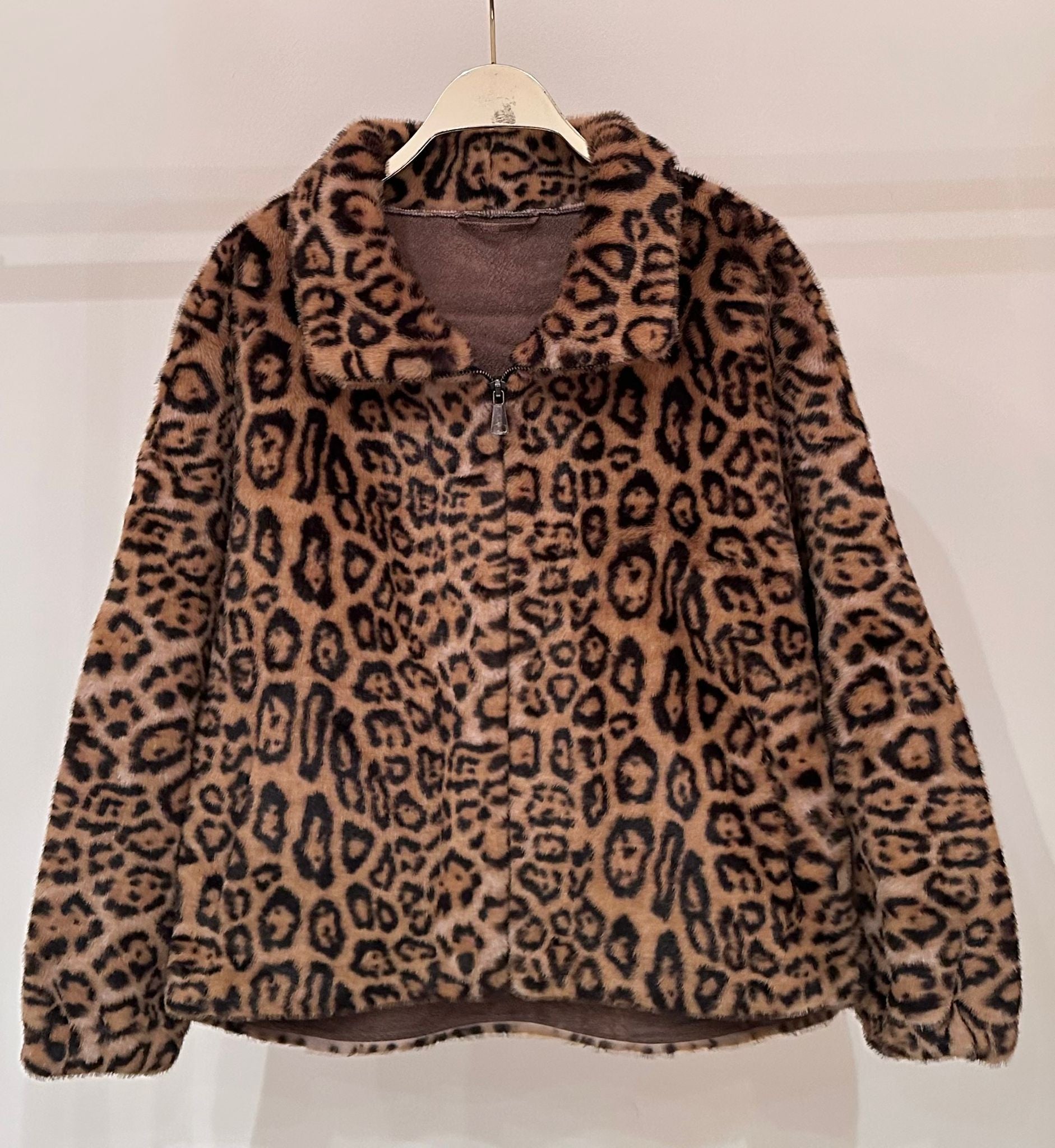 Zippered Closure Wide Collared Leopard Print Loose Fit Faux Fur Jacket with side slip pockets and long sleeve