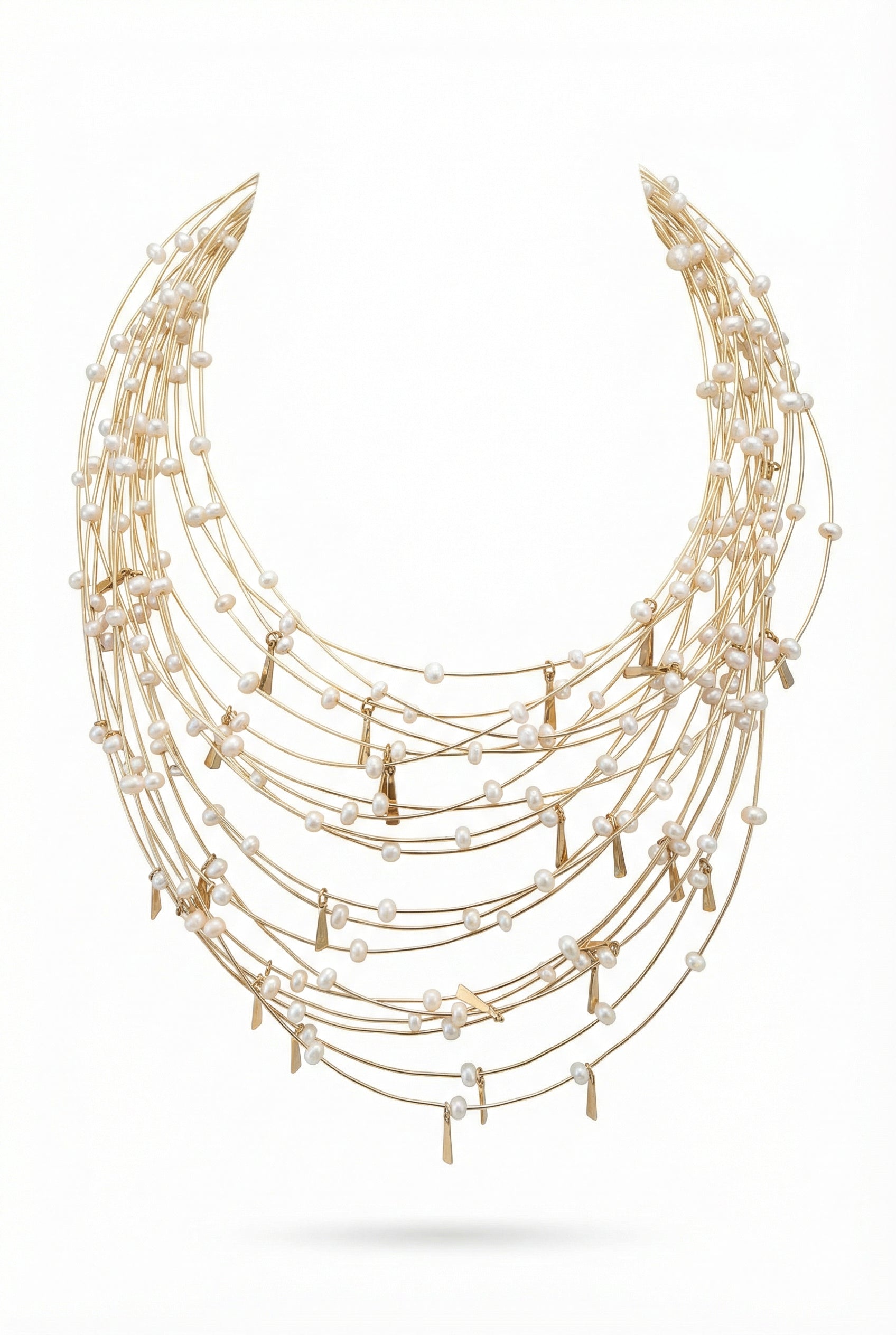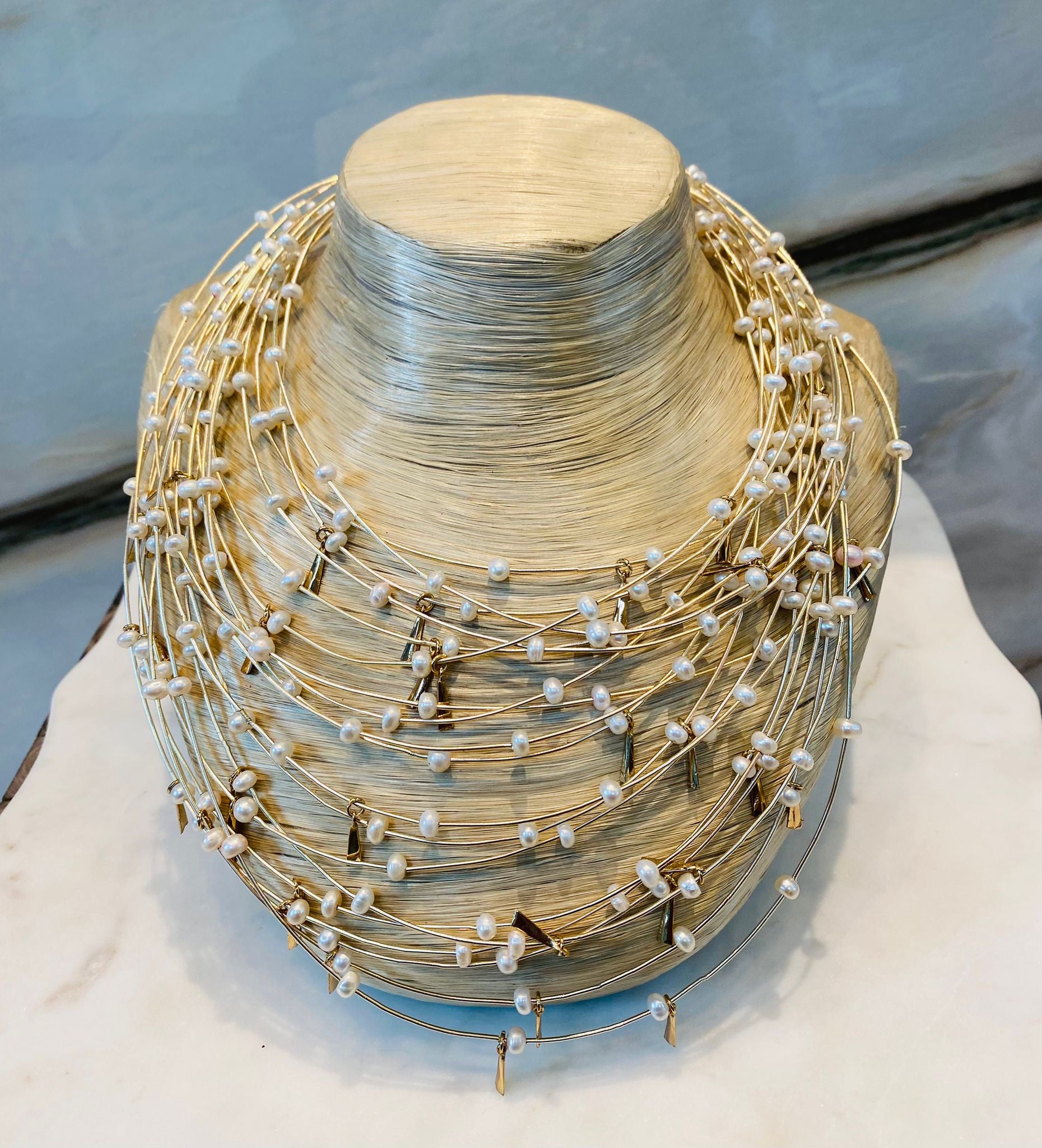 Multi Strand Gold Wire Necklace with freshwater pearls and gold details