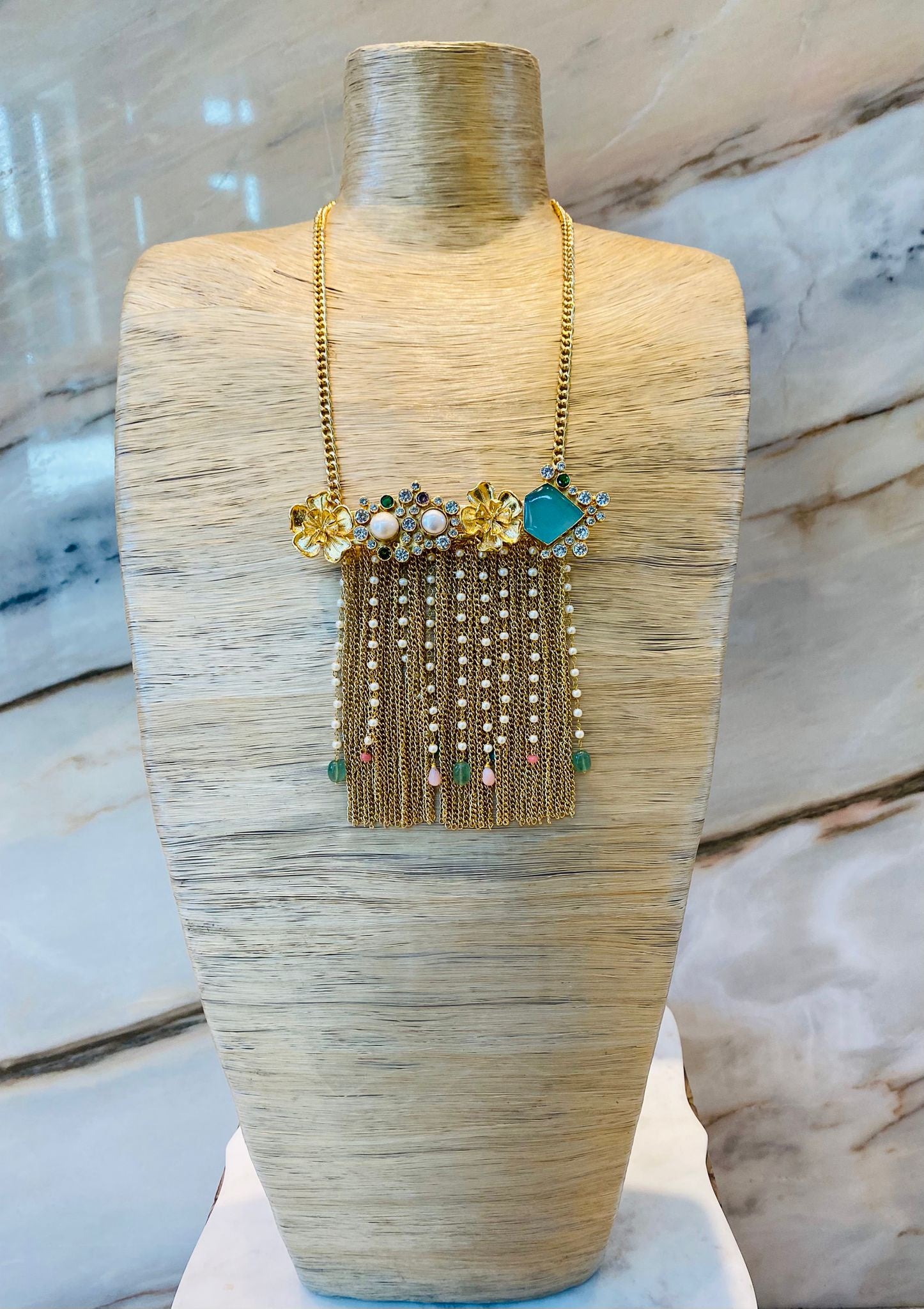 Chain Necklace with long fringe tassel pendant with beads and freshwater pearl details