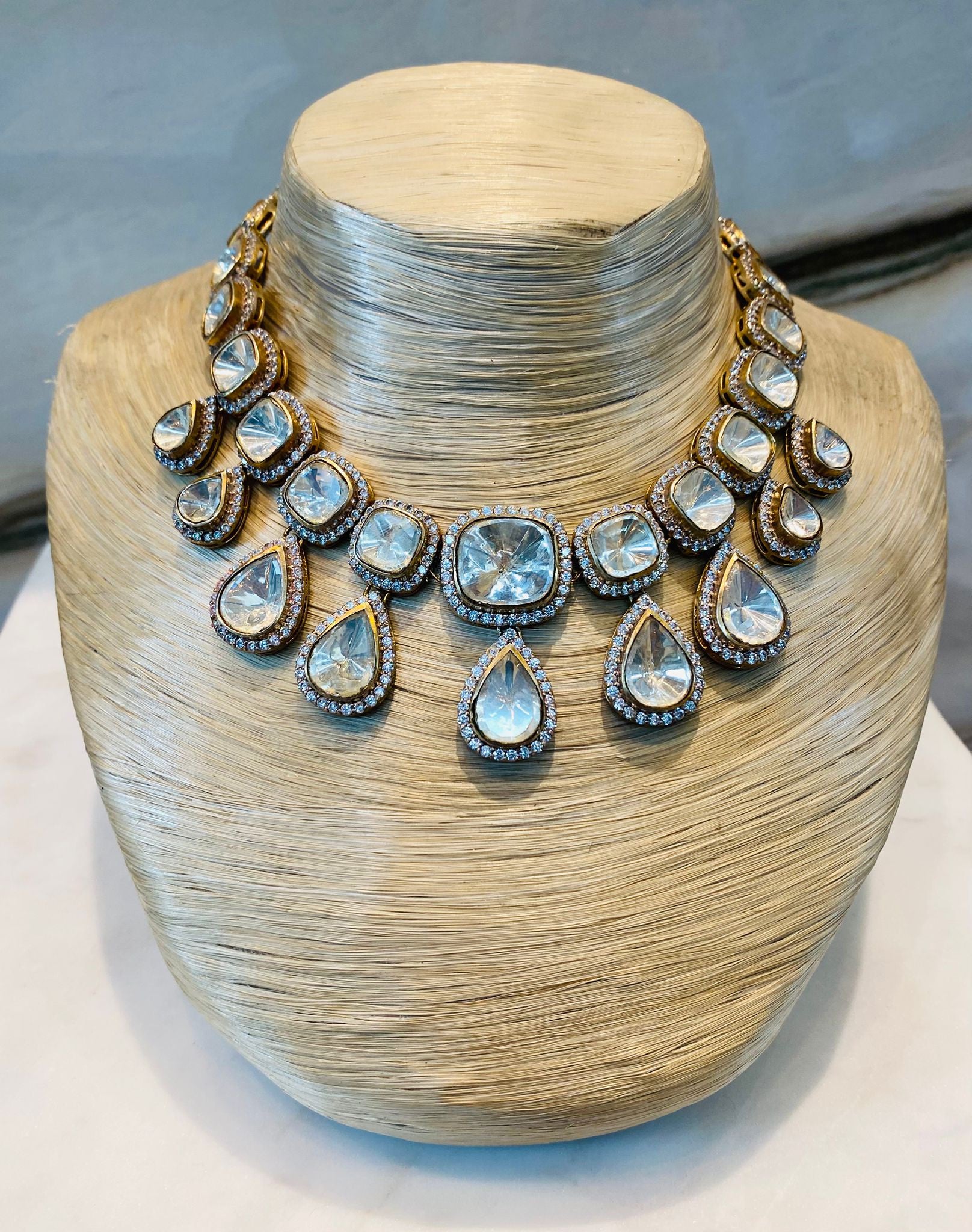 Square Cut Diamond Choker Necklace with teardrop diamond shaped details and adjustable brown layered strap details with pearl beads fringe
