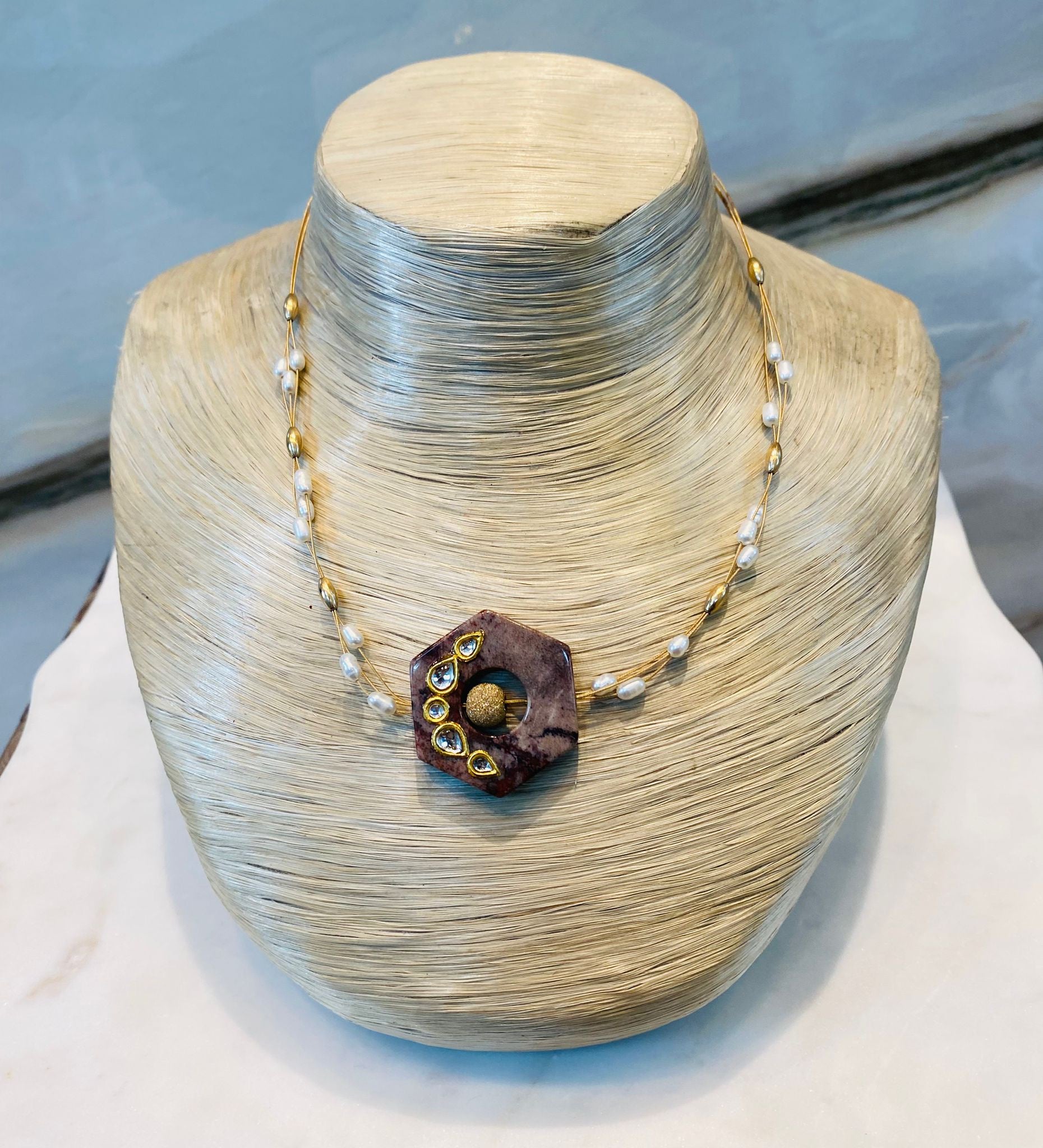 Multi String Necklace with pearls and gold beads and hexagon shaped brown stone pendant with stud details