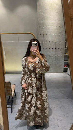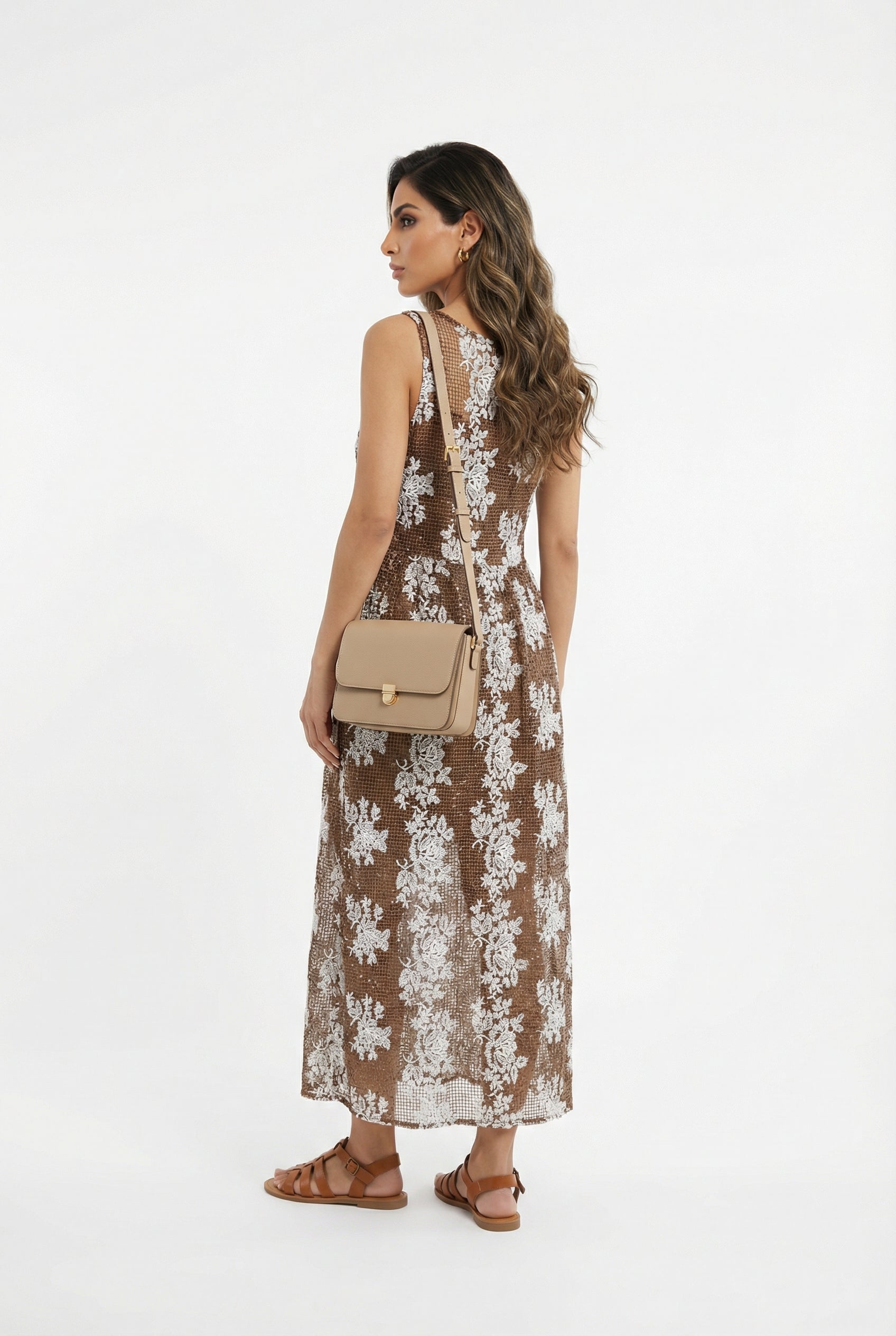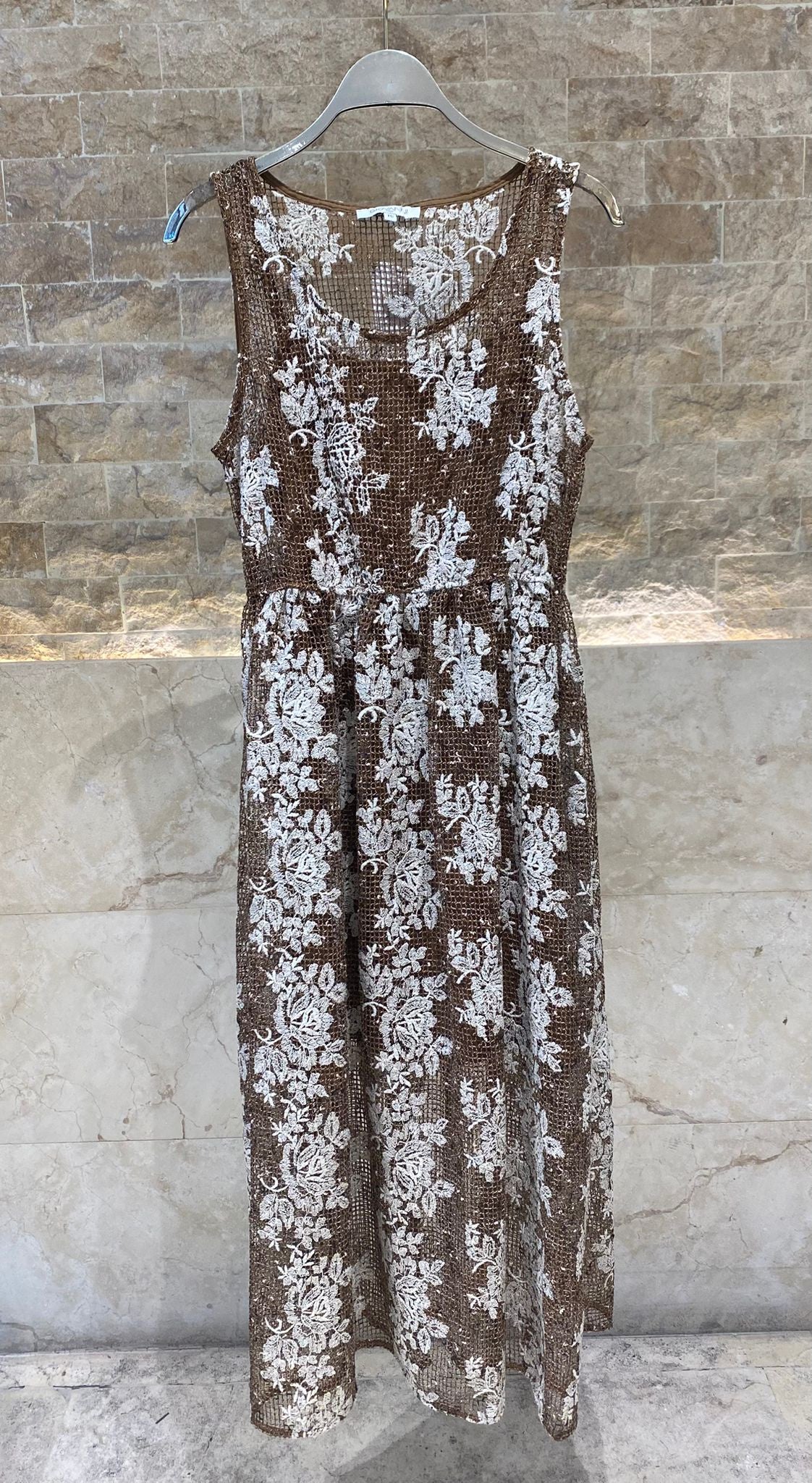 Scoop Neckline Fishnet Embroidered Floral Patterned Sleeveless Long Dress with elastic waistband and brown strappy slip lining
