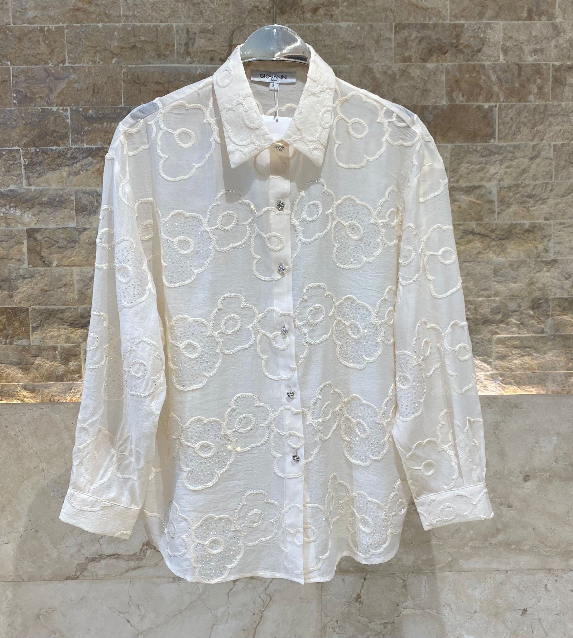 Buttoned Classic Collared Floral Patterned Embroidered Sheer Oversized Shirt with embellished rhinestone details, drop shoulder and long sleeve with buttoned cuff